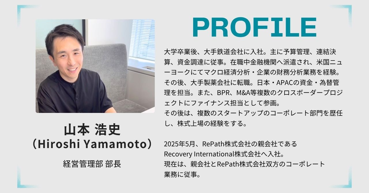 まずは、RePathのコーポレート部門の責任者である山本さんのプロフィールをご紹介します!