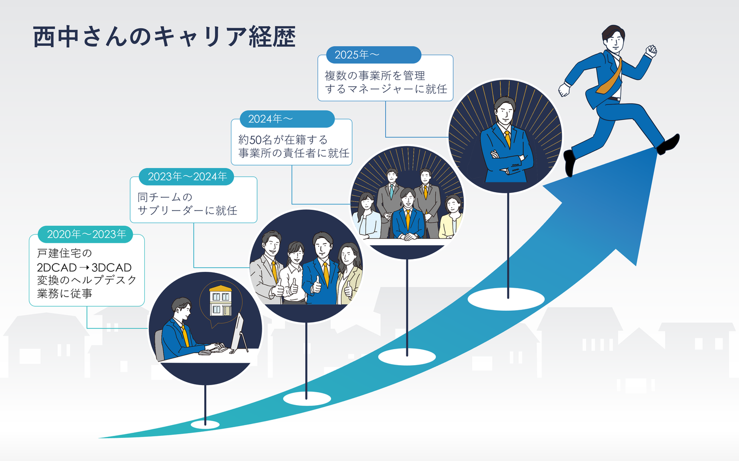 2020年に新卒で入社しました、西中と申します。現在は、複数の事業所を管理するマネージャーをしております。大学1年時に理系全般を学び、2年時以降はその知識を基に、興味を持った情報デザイン学科に進みました。その後さらに大きな括りで「空間」に興味を持ち、最終的には空間デザイン研究室に在籍し、勉強していました。そこでは、内装のデザインや配色を検討することや、IT技術を駆使して人とまちを結び付けるにはどうすれば良いか、または空間にどのような役割を持たせるかということを学んでいました。そのため、Revit(BIMソフト)やVRの使用経験もありましたね。