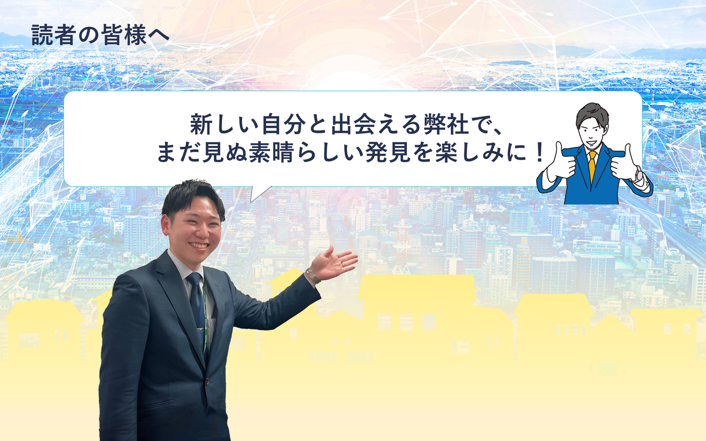 はい!私自身、弊社に入社してから、自身の知らなかった一面をたくさん見つけられていて、やはり周囲の環境って大切だなと感じています。学生時代からの成長はもちろんのこと、「自分ってこんな人間なんだ!」と新たに発見できる自身の良い一面や、気持ちがあり、その度に面白いなと感じます。私自身がそうであるように、弊社には学生時代や前職では出会えなかった自分に出会えるチャンスがあると思います。もし弊社に興味を持っていただいている方がいらっしゃればぜひ、ともに頑張っていきたいですし、弊社で叶う新たな発見を楽しみにしていただきたいです!
