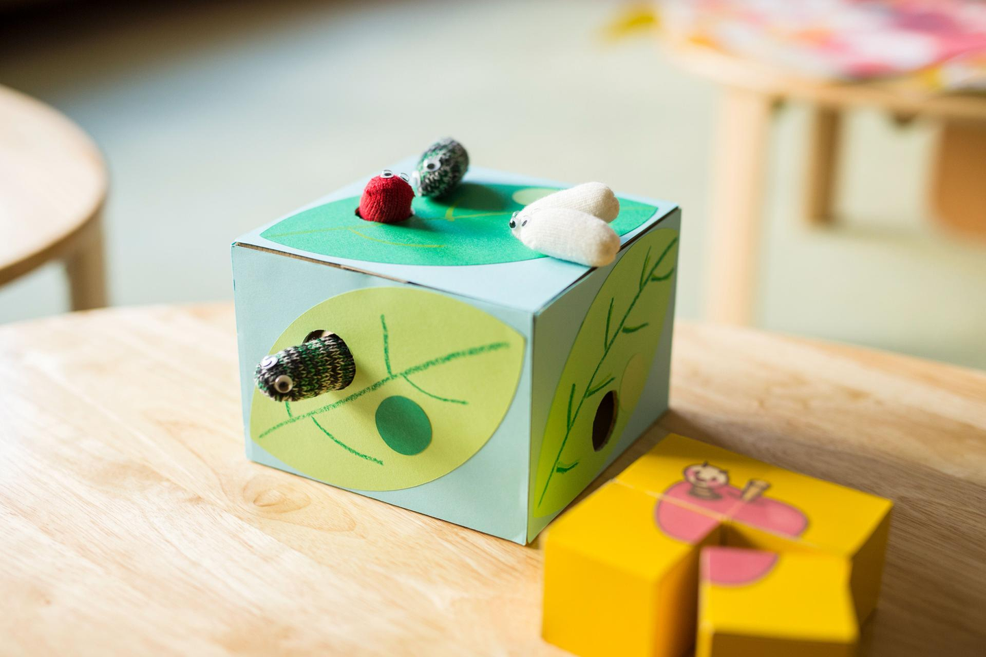 1日の流れは「あいさつ」から始まり、「うた&運動」「絵本」「思考&概念」「手先活動」と続きます。手先を動かす体験型のハンドメイド教材を中心に、フェルトなど多様な素材を使い、子どもが主体的に学べる工夫をしました。