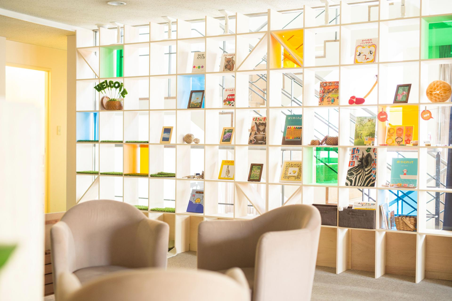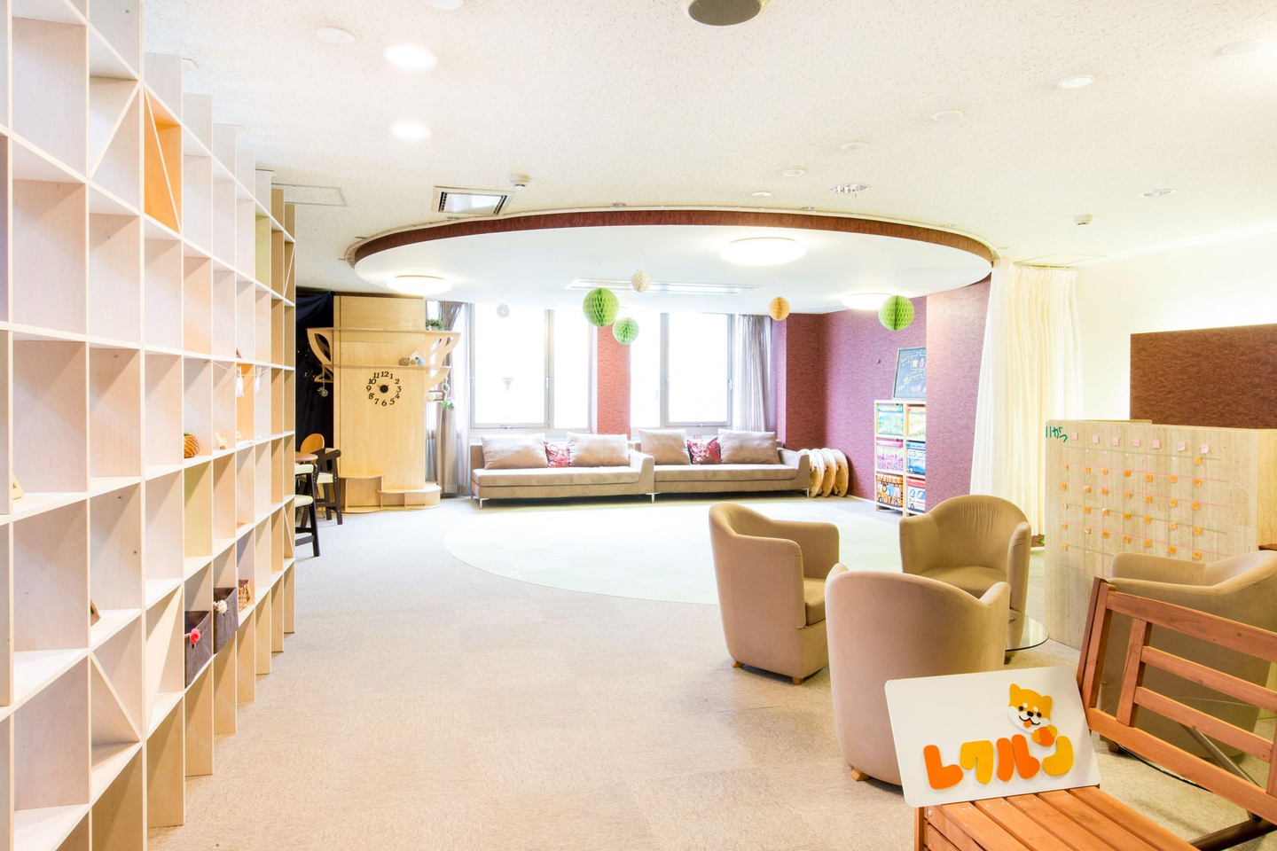 教室空間も「光・風・草木」をモチーフに、明るく爽やかで優しい雰囲気づくりを目指し、プレイスペースやラウンジスペース、ユーティリティスペースなど、子どもも大人も安心して過ごせる環境を整えました。