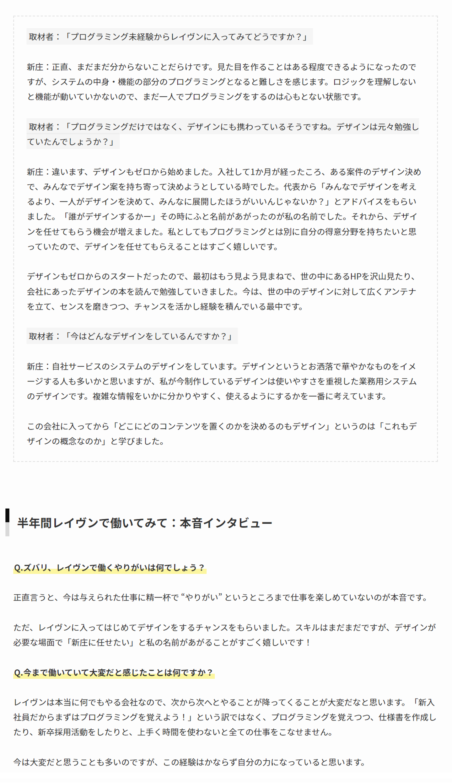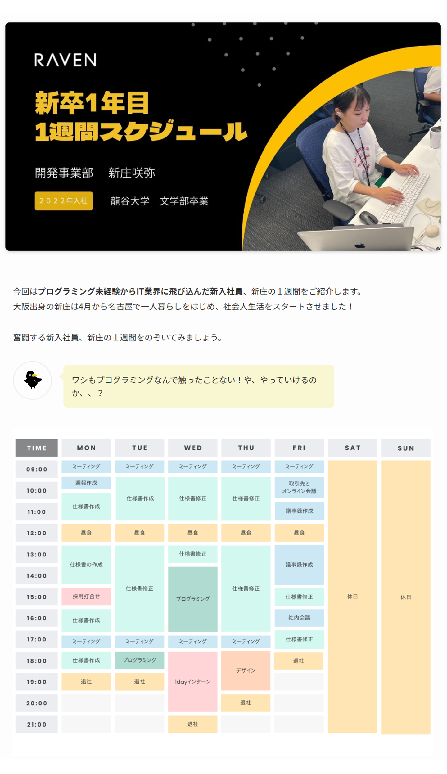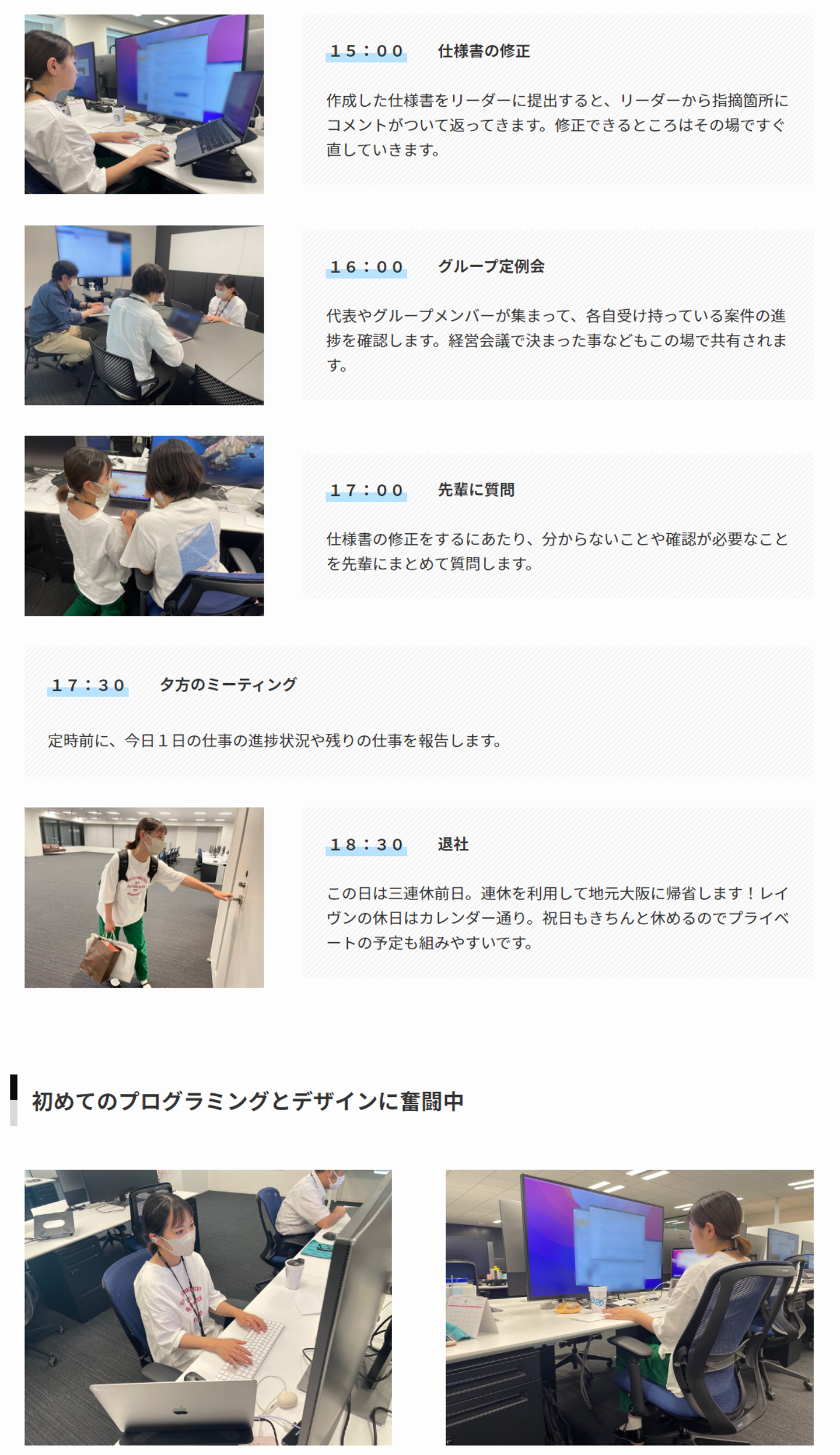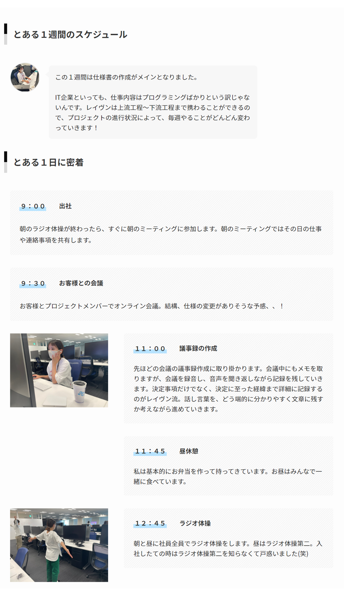 今回は プログラミング未経験からIT業界に飛び込んだ新入社員、新庄の1週間をご紹介します。大阪出身の新庄は4月から名古屋で一人暮らしをはじめ、社会人生活をスタートさせました! 奮闘する新入社員、新庄の1週間をのぞいてみましょう。 朝のラジオ体操が終わったら、すぐに朝のミーティングに参加します。朝のミーティングではその日の仕事や連絡事項を共有します。 9:30 お客様との会議 ...