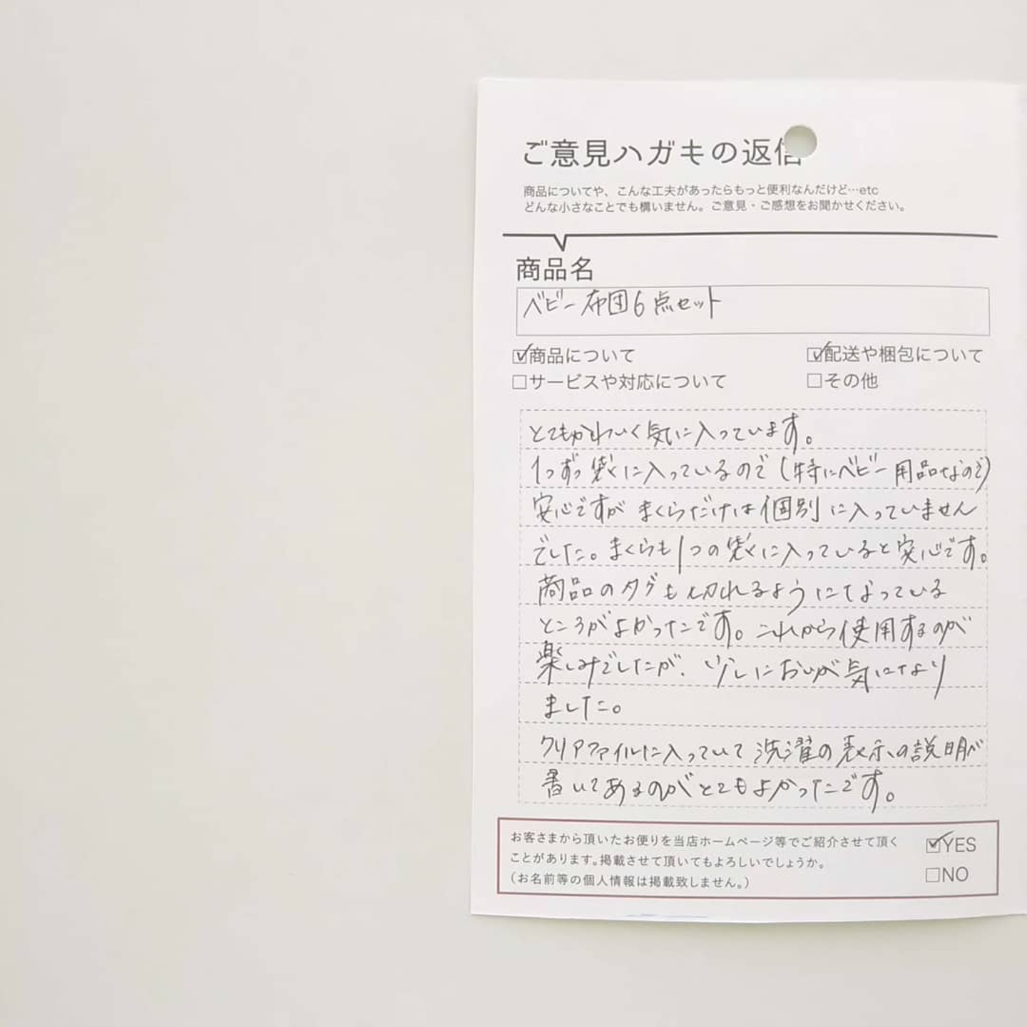 今回は『お布団セットの枕だけが個別包装されていなかった』というおハガキをいただき、商品の包装を見直しました。