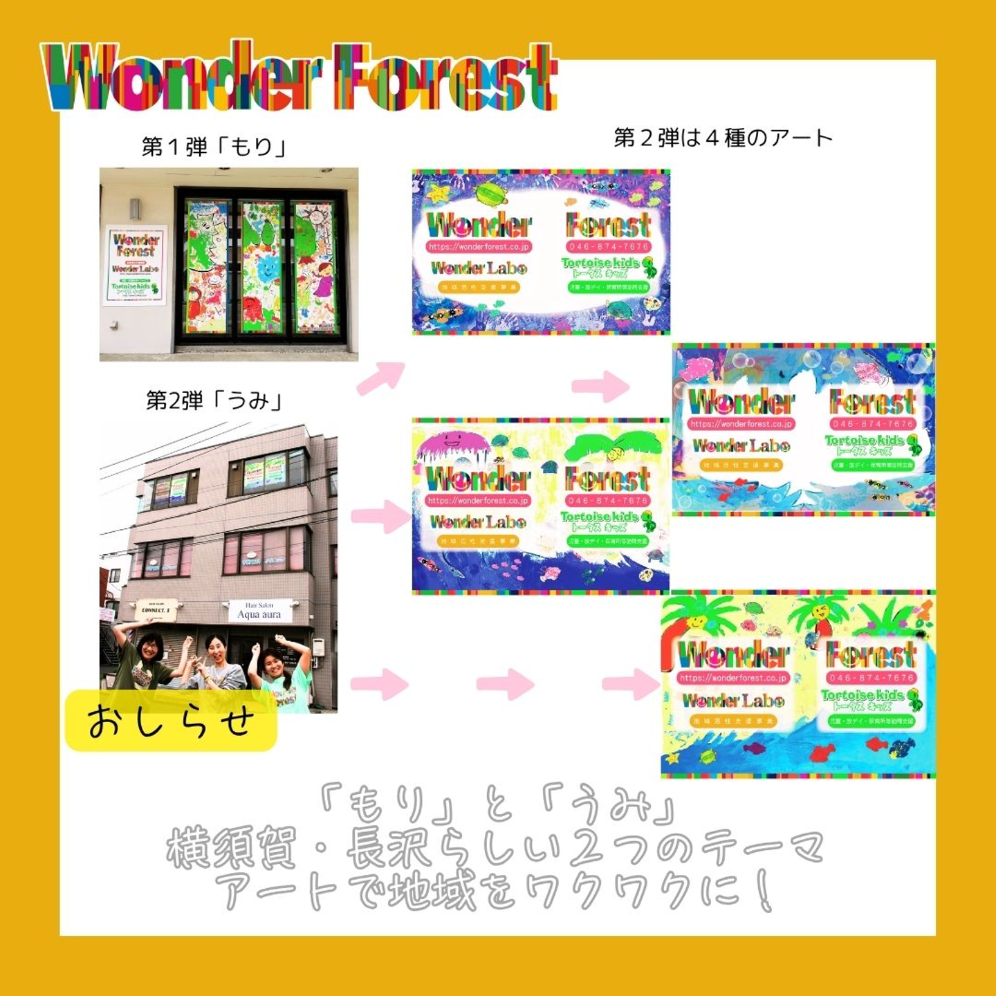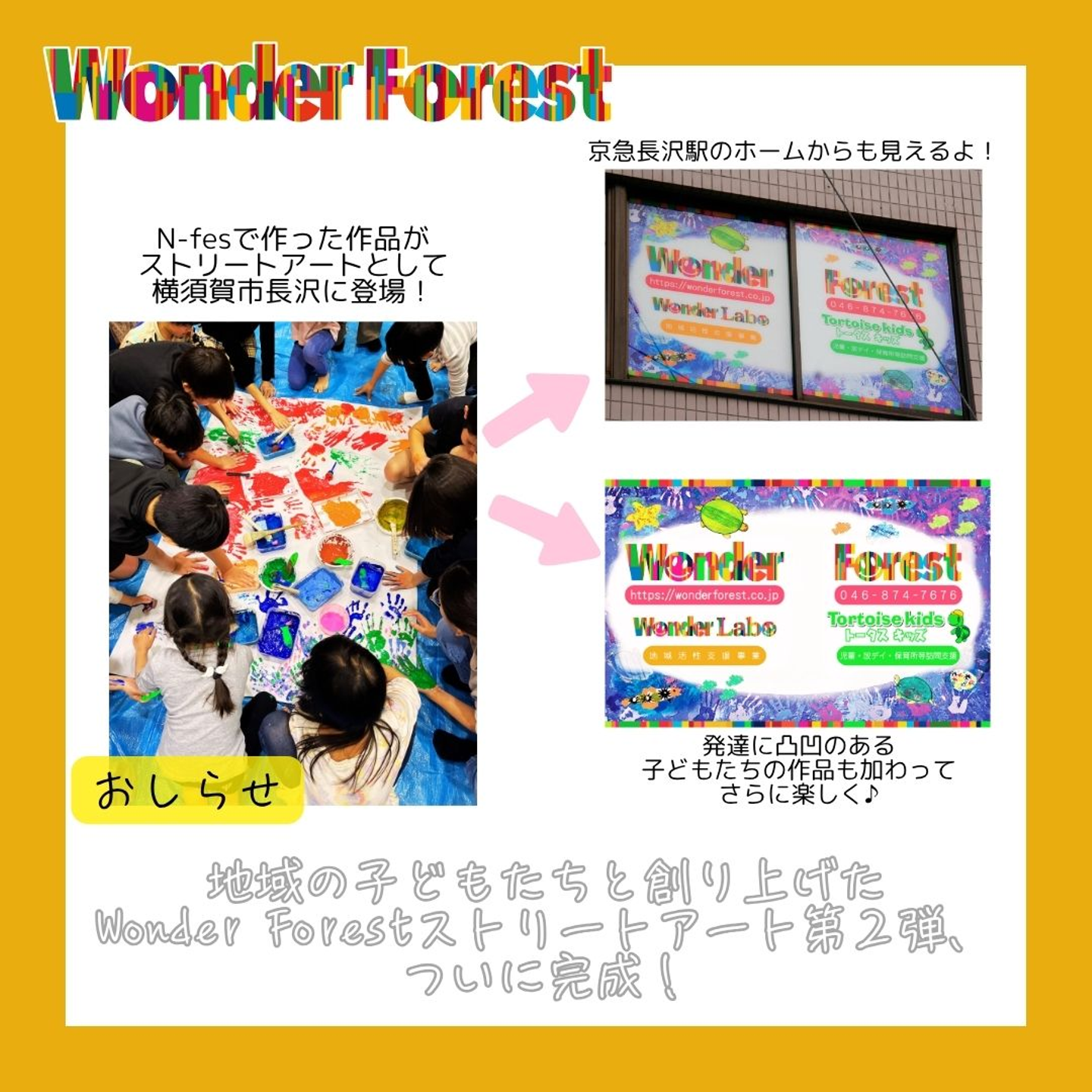 横須賀市市民協働推進補助金事業「N-fes」にて、地域の子どもたちと共に創り上げたストリートアートが、Wonder Forestの事務所がある3階ガラス面についに登場(横須賀市長沢1-32-11)!
