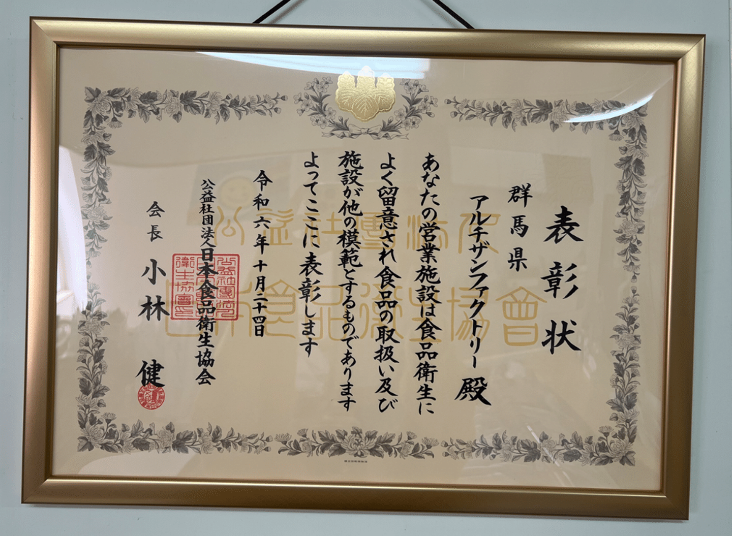 厚生労働省・公益社団法人日本食品衛生協会主催の「日本食品衛生協会 会長表彰部門 食品衛生優良施設」としてアルチザンファクトリーが受賞しました!