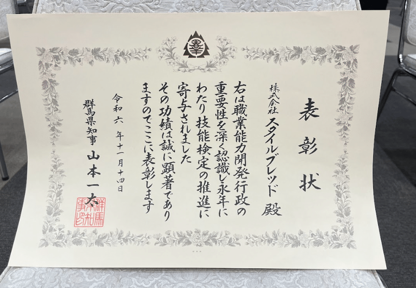 群馬県よりパン製造技能士の取得において評価いただき「技能検定優良事業所」として受賞いたしました。