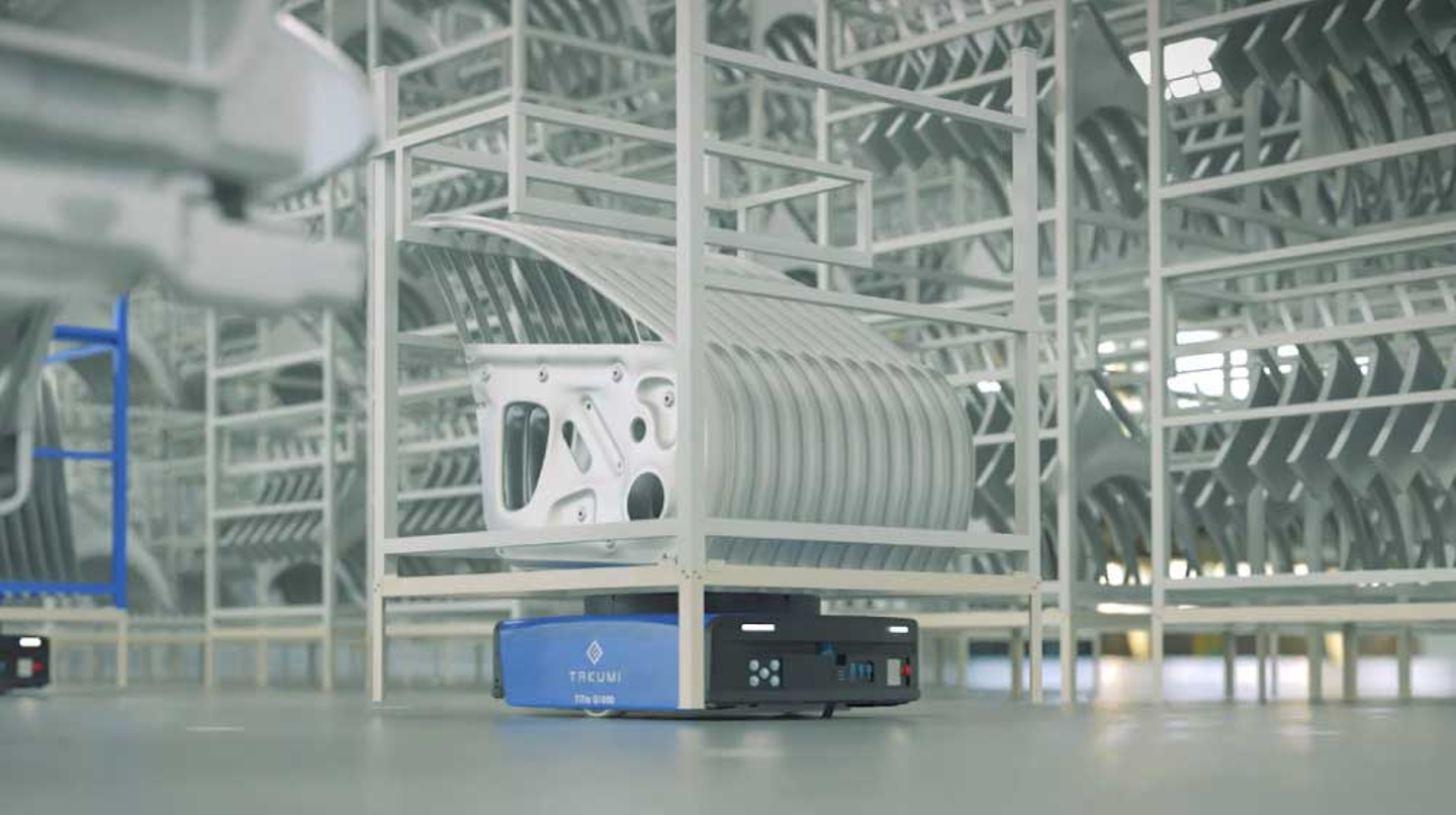 動画では、提携先である株式会社匠のAGV(無人搬送車)が工場を自動走行する様子が描かれています。