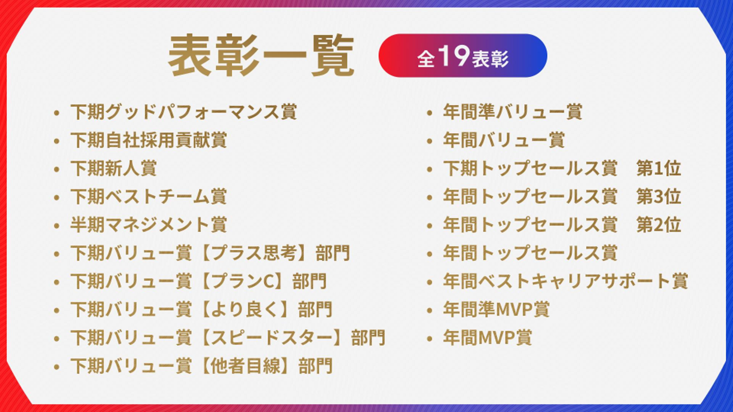 個人・チーム・バリュー体現など、さまざまな角度から社員の活躍を表彰する場です。