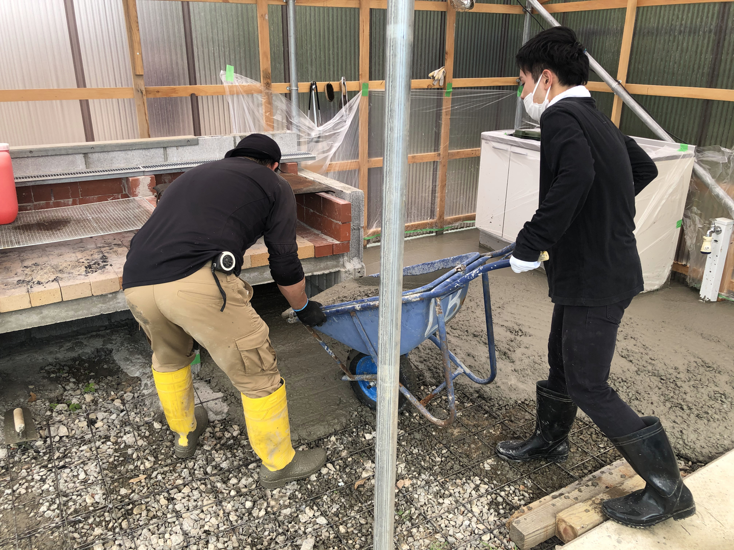 今日は、事務所裏のBBQスペースの土間コンクリート打設を行いました。