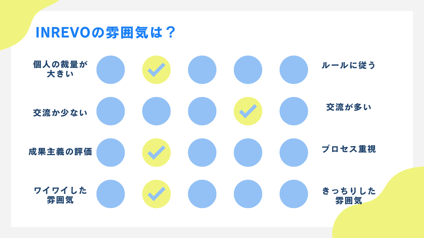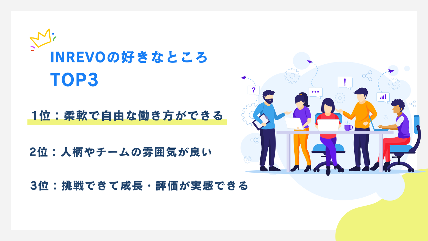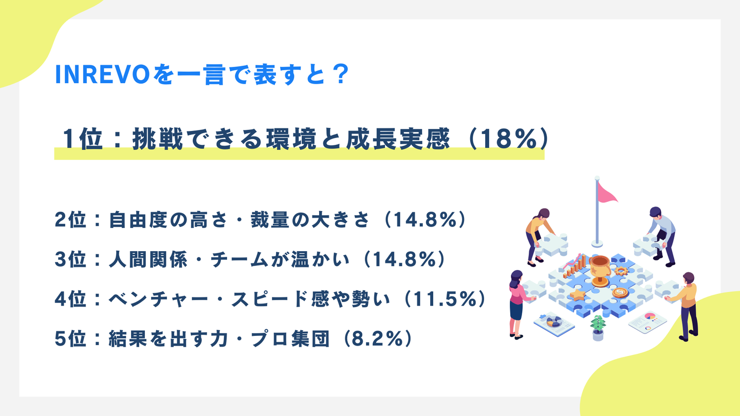 今回は全社員アンケートを基に、「INREVOの好きなところ」、「INREVOを一言で表すと?」、「INREVOの雰囲気は?」の3つのテーマを、数字と社員コメントで読み解ける形にまとめました。