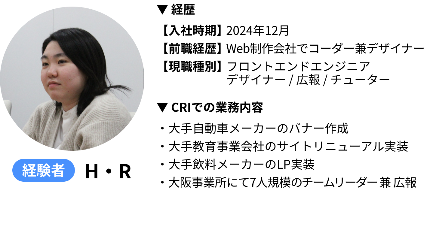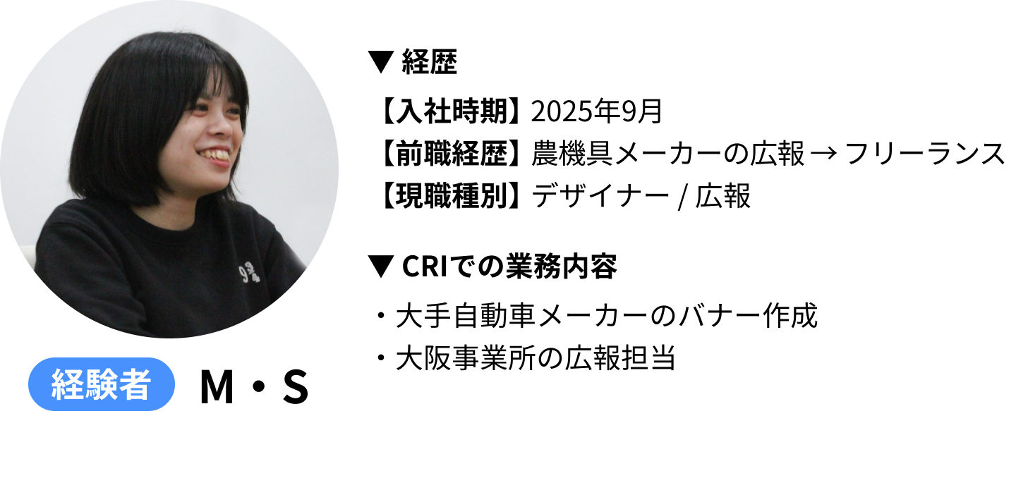 私は農機具メーカーの広報→携帯ショップの販売員→フリーランス→CRI大阪事業所です。