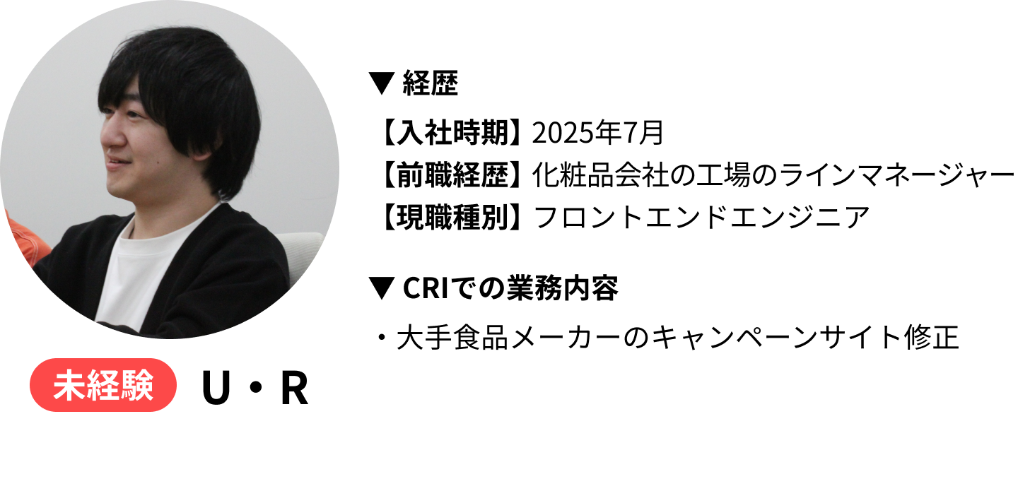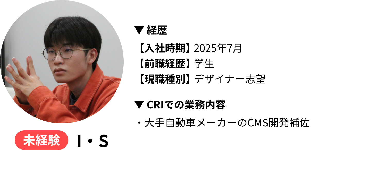 色々考えていた時にWantedlyでCRIを見つけて説明を聞いてみたら、スキルの幅を広げるために色々な職種を経験したい自分の意思とマッチしているな!と感じて入社を決めました!