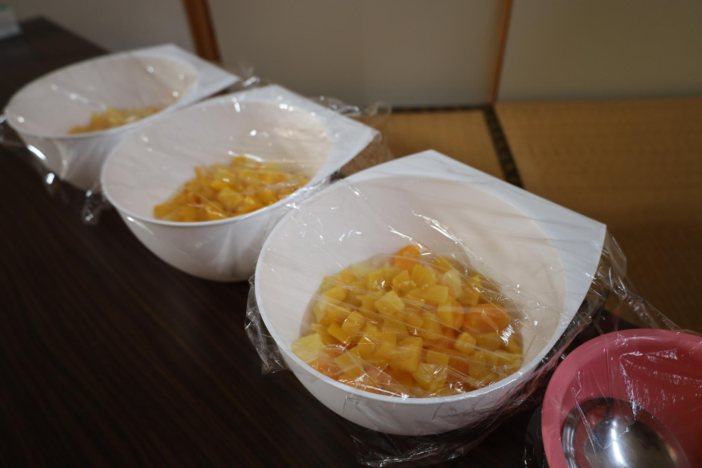 「デザートを作るゾ!」チームは、フルーツポンチを作りました。みんなから「美味しい!」「おかわり!」と大好評でした。