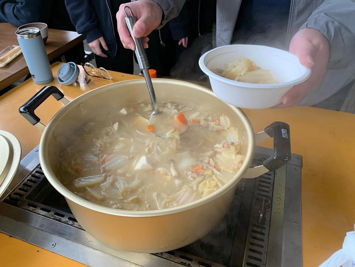「うどんを作るゾ!」チームは、臨機応変な対応力とタイムマネジメント力で、うどんからすいとんへ急遽方向転換。「すいとん」を久しぶりに食べる社員も多く、おかわりする人が続出しました!