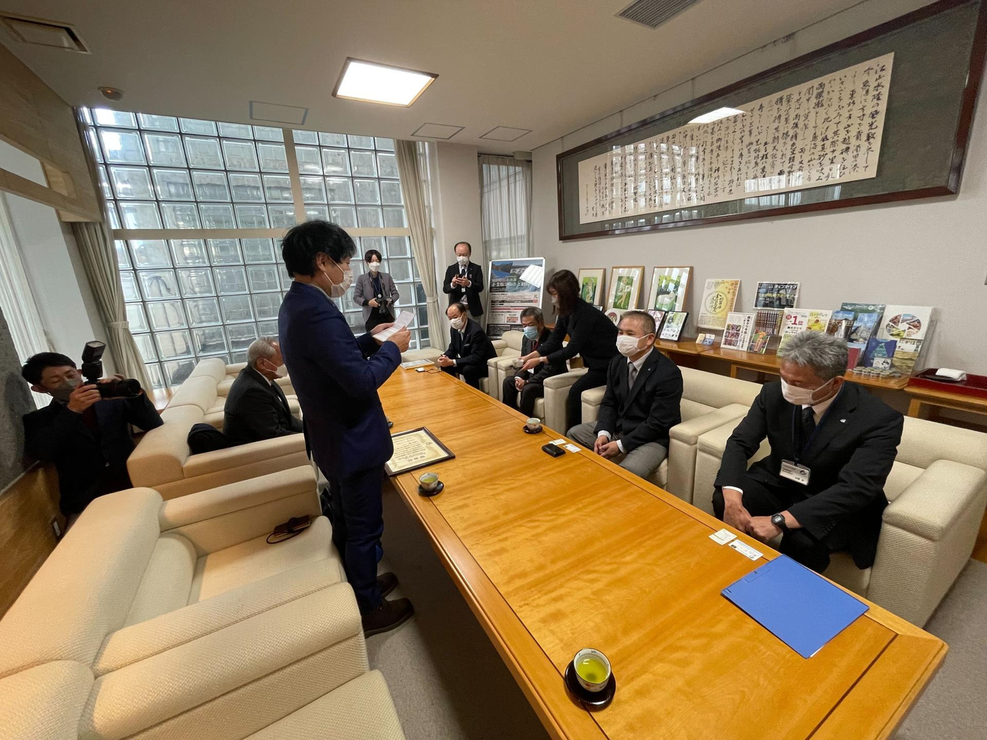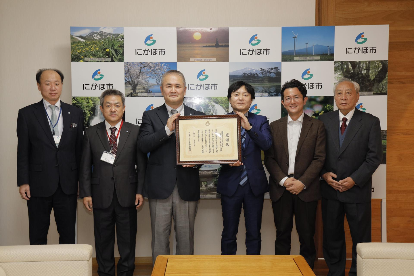 にかほ市役所にて、那須マテリアル株式会社 代表取締役 星 彰治 様をお迎えして寄付贈呈、にかほ市長から感謝状の贈呈式が行われました。