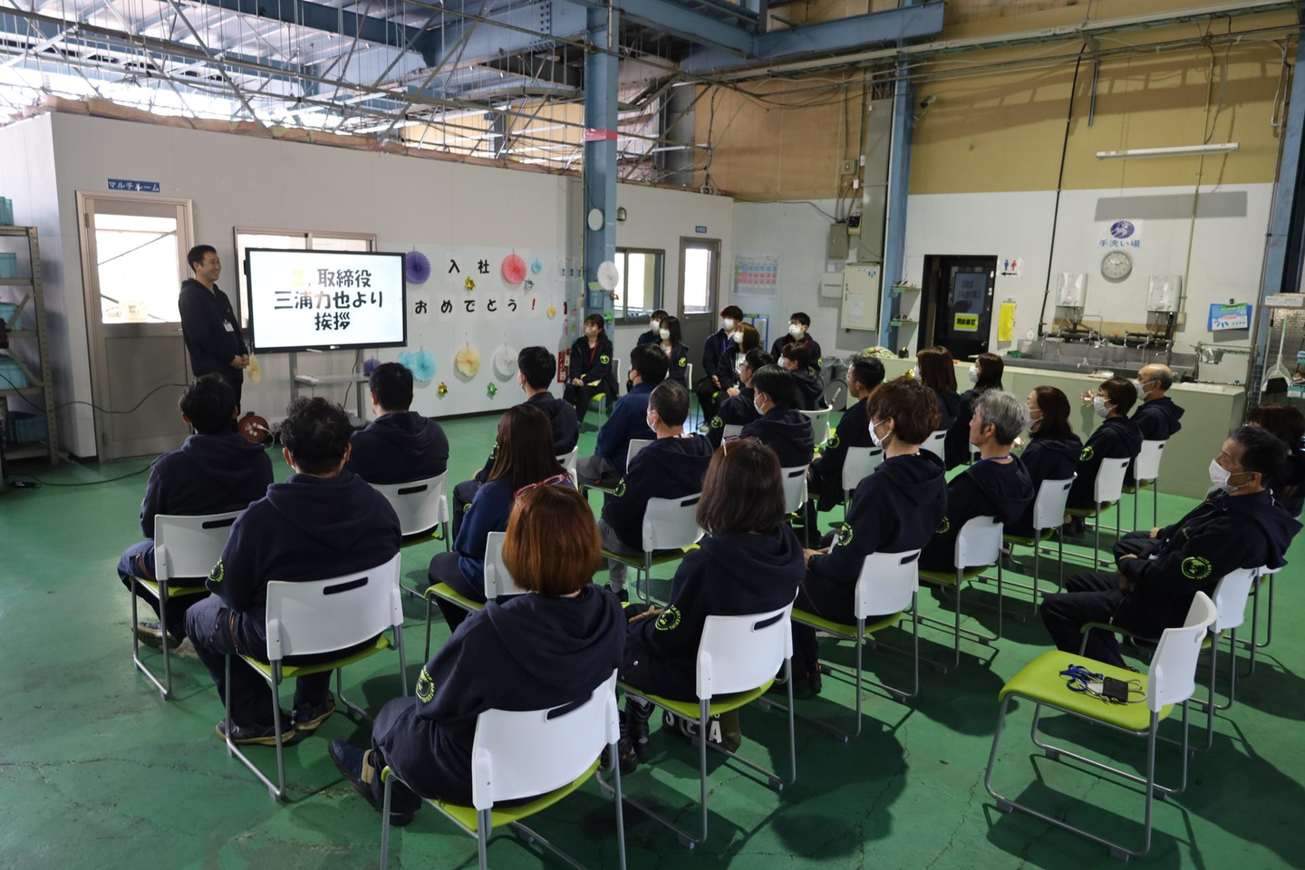 まずは全社で式典を開催。佑介さん、力也さんの挨拶のほか、記念品の贈呈も行われました。他にもなんと、新入社員のみなさんが自作した自己紹介動画の放映がありました。Z世代のみなさんは「自分を表現する」ことに慣れており、動画もサクッと作れるそうです。どんな高校生活を送ったのか、どんな仲間と部活に励んだのか、卒業制作は何を作ったのか、本当に見応えのある動画でした。やはり共通していることは「コロナ禍で制限された学生生活だった」ということ。ようやく諸々の制限が解除されたところで始まる新生活。会社でも個性を生かして思いっきりチャレンジして欲しいです。