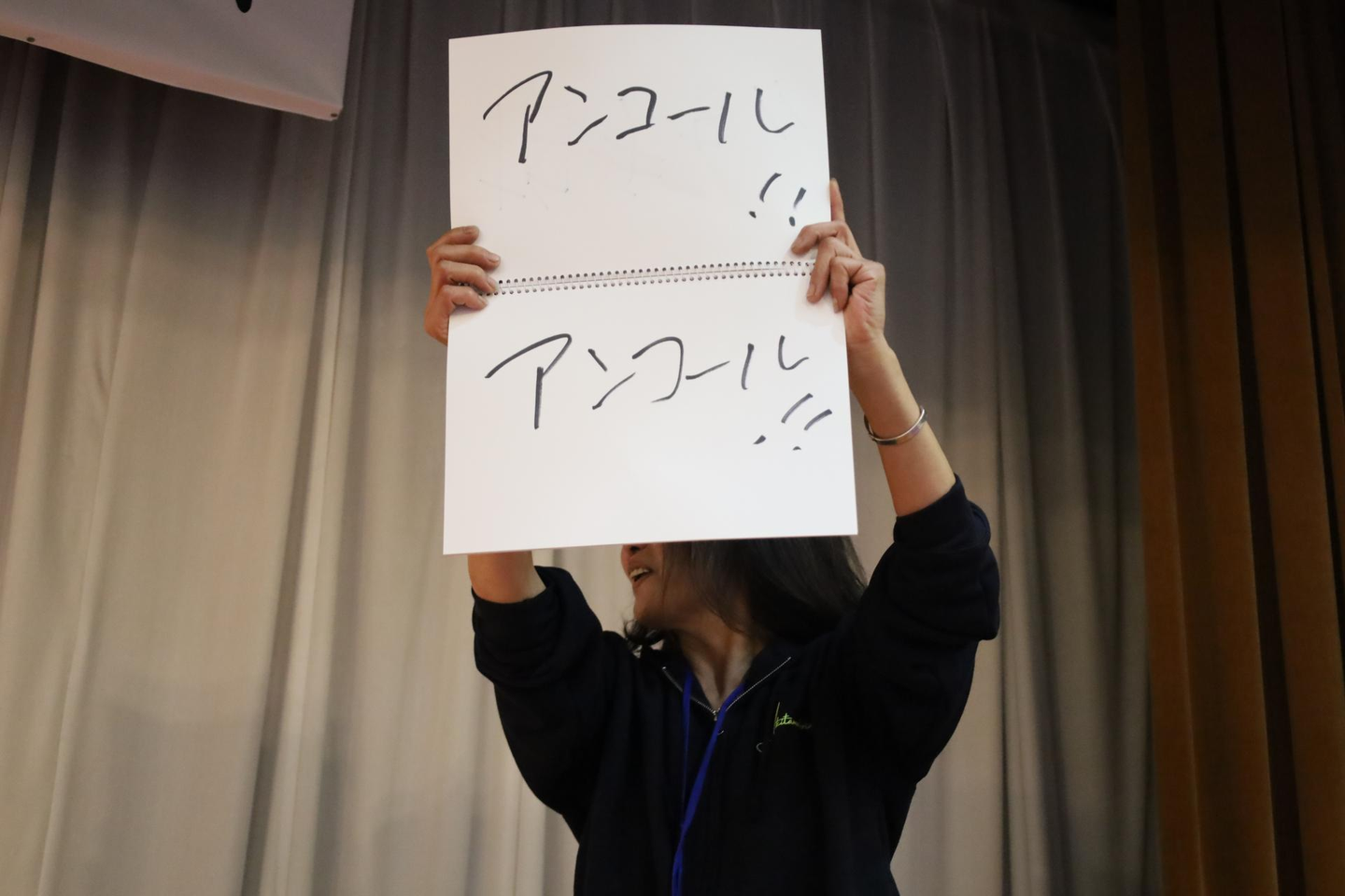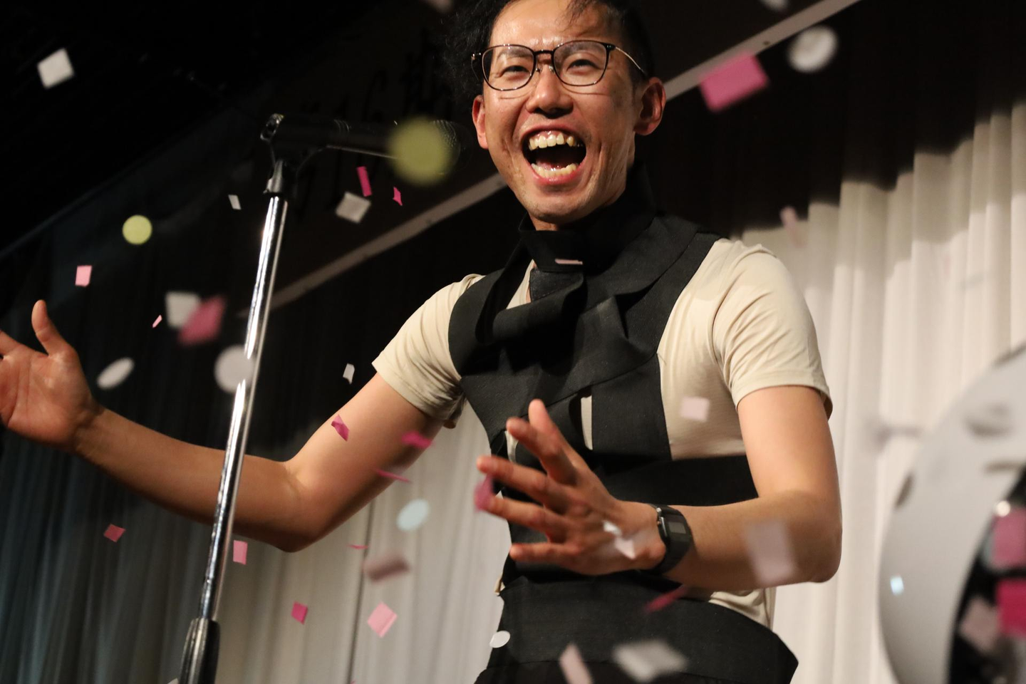 自ら手配した衣装で、元気にワンマンステージ。まるで、そこはディナーショーに早変わり。新入社員も急遽、お手伝いし、ステージに花を添えて(?)花吹雪を撒いて(?)くれました!
