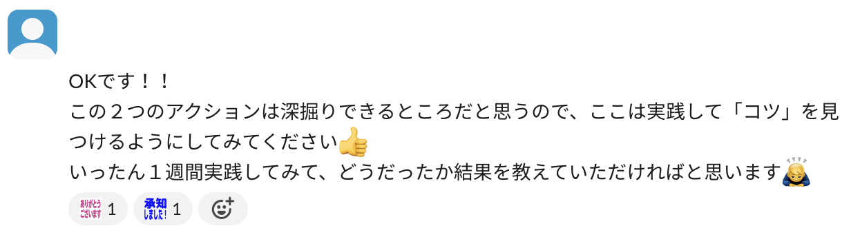 先日ピラティスチームで開催した時には、「こんなマネジメントの仕組みを、会社全体でやってくれて、本当にありがとうございます」「学びが深いです」といった長文の感想をくれました。