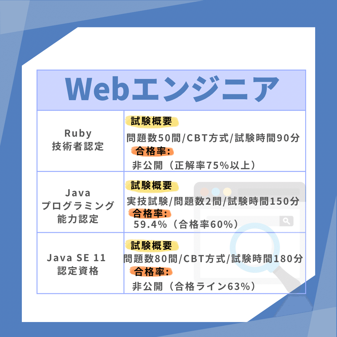 - Java プログラミング能力認定試験:実践的な実技試験で、2問を150分で解く形式。合格率は約60%で、実務力が試されます。