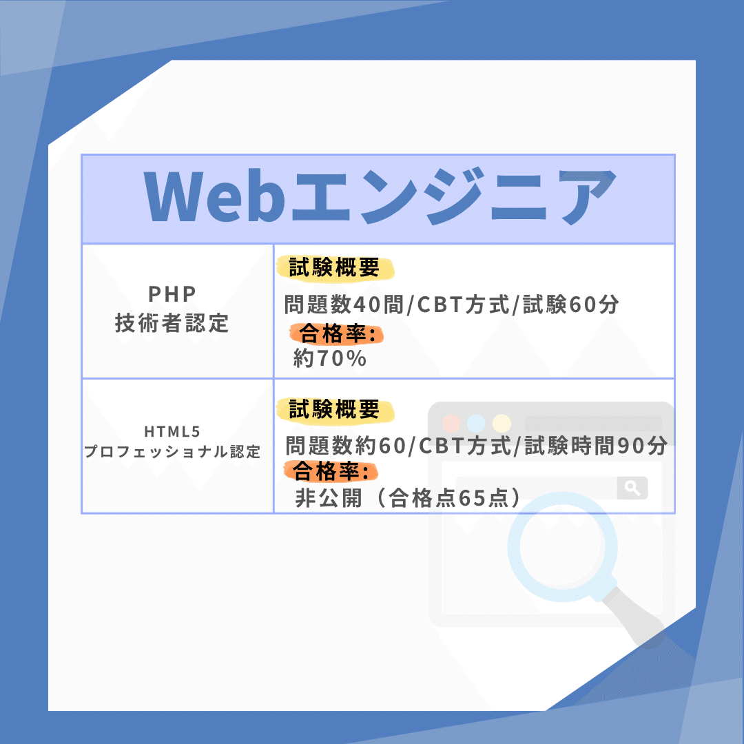 - PHP技術者認定:60分で40問と比較的取り組みやすく、合格率は約70%