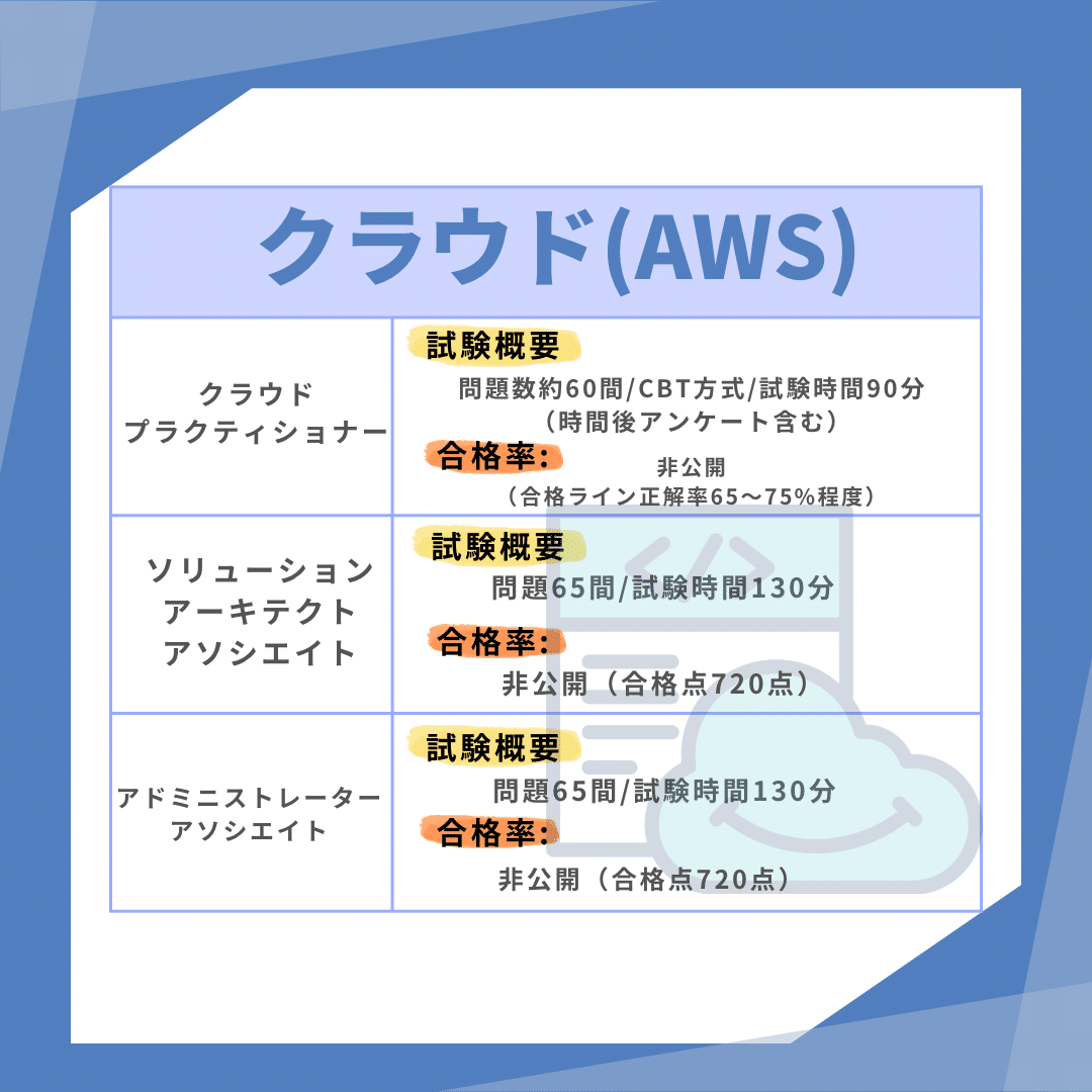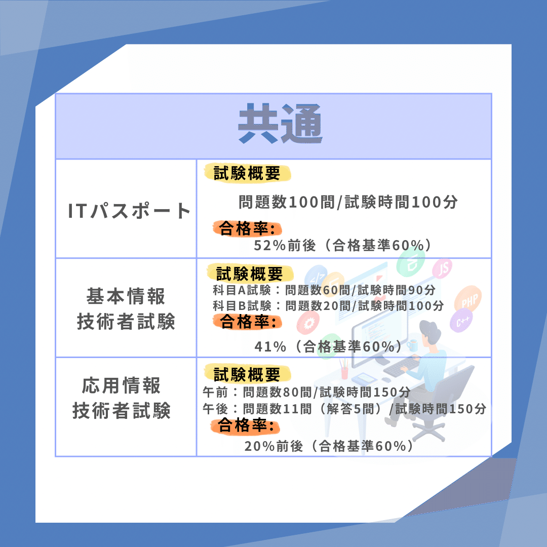- ITパスポート:IT全般の基礎知識を問う。合格率52%前後