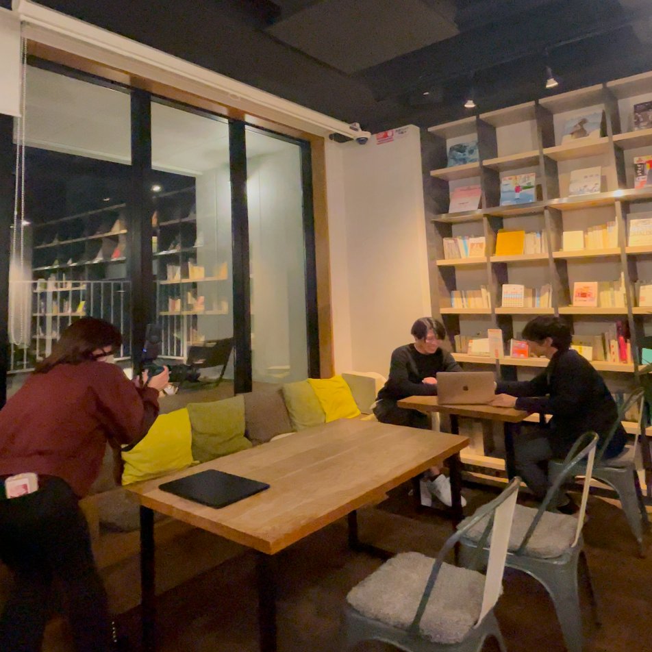 素敵なライブラリースペースで本がびっしり並んだ棚を背景に、和やかな雰囲気で撮影かできました。