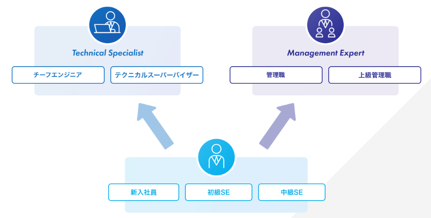 一般的なエンジニアのキャリアは「プログラマ→システムエンジニア→プロジェクトリーダー→プロジェクトマネージャー」のような流れが多いですが、高度でより専門性の高いスキルが必要な時代になってきました。技術を追求し、これを武器にプロジェクトを遂行するテクニカルスペシャリスト、部下の能力を最大限に引き出し、会社を未来に導くマネジメントエキスパート。目の前の利益だけを求めるのではなく、社員1人1人の個性を伸ばすことによって価値を高め、人生を豊かにすることにより5年、10年と会社と共に成長しあえる人材育成を目指しています。
