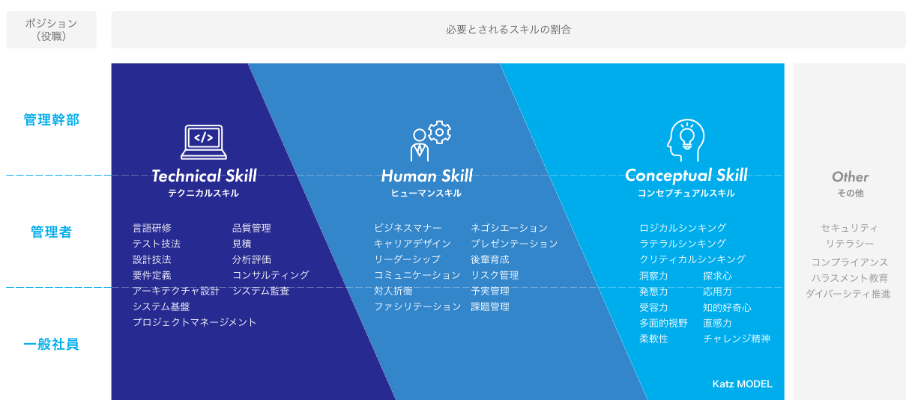 トラストシステムでは、テクニカル・ヒューマン・コンセプチュアルスキルの3軸を基本として教育を行います。マネジメントのレベルが上がるごとに役割、必要とする能力が変わります。技術者であるかぎり、ベースはテクニカルにあることは言うまでもありません。しかし先を見れば、近い未来テクニカル部分の多くはAIに置き換わることになるでしょう。何が大切で、何を学ぶべきなのか。会社は「人」そのもの。1人1人がSEとして輝けるように教育を一層充実させていきたいと考えています。
