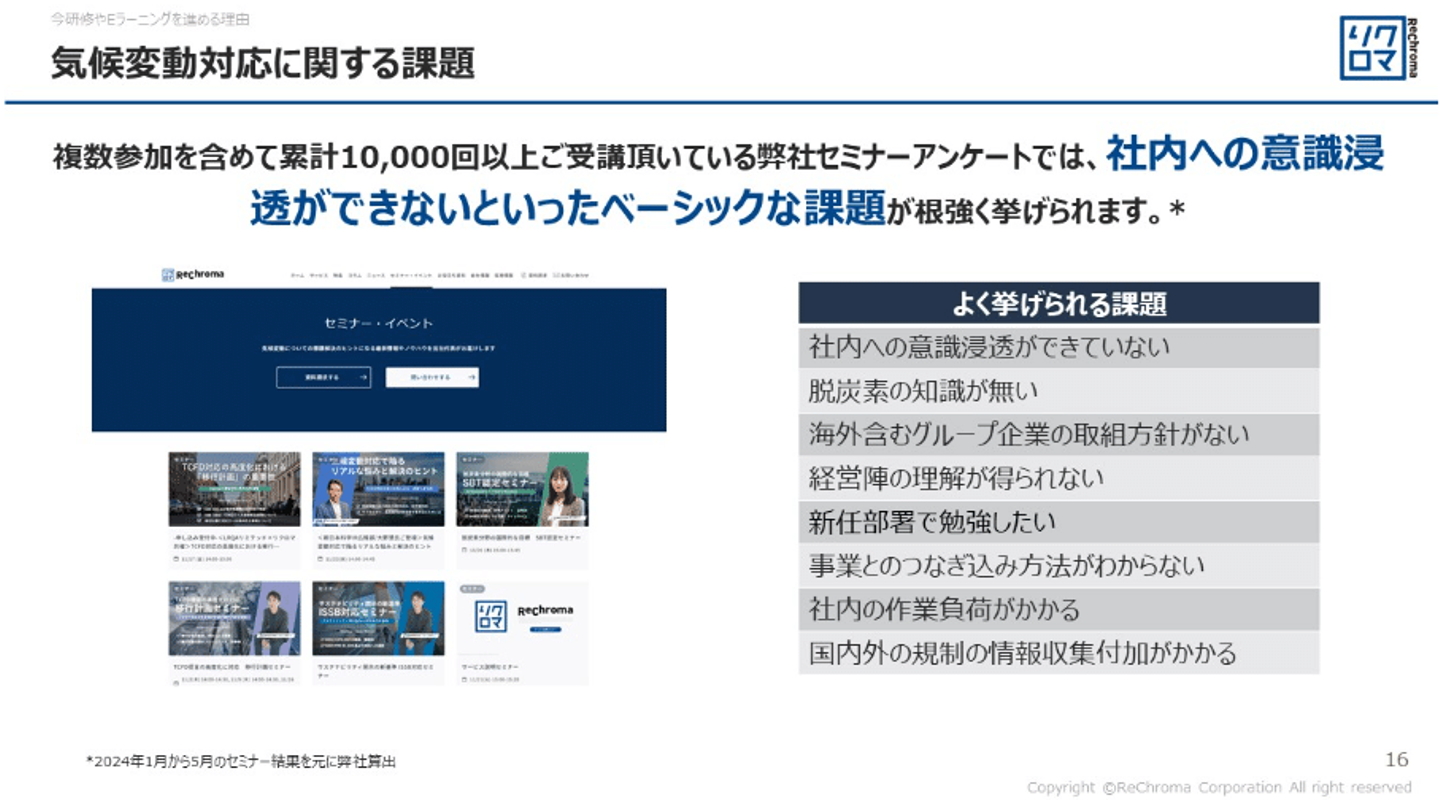 私たちは、大手企業のサステナビリティ部や経営企画部と多くの接点を持っていますが、人事部や総務部から社員研修の要望もよく受けます。2022年頃から、企業の外部への情報開示が進み、いよいよ目標に対して行動を起こす段階に入りました。しかし、社内での意識浸透が十分でないという基本的な課題が浮かび上がってきました。