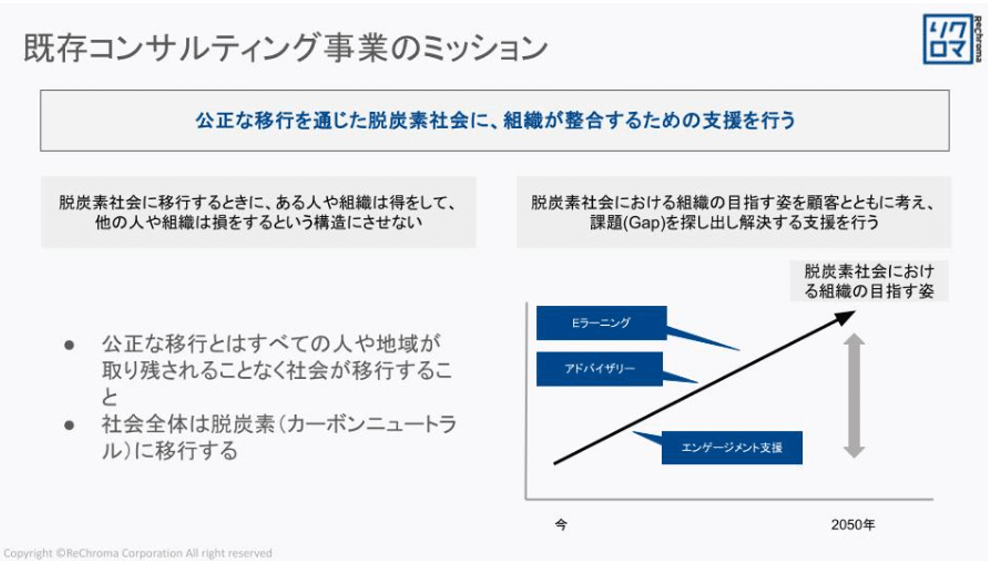 そのような背景から2024年6月にコンサルティング事業が何を提供するのか見直した結果、「公正な移行を通じた脱炭素社会に組織が整合するための支援を行う」ということに決定しました!