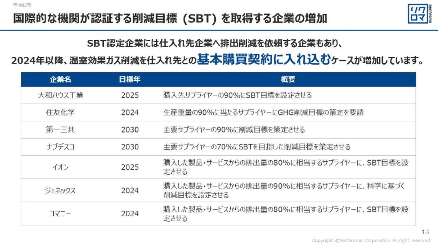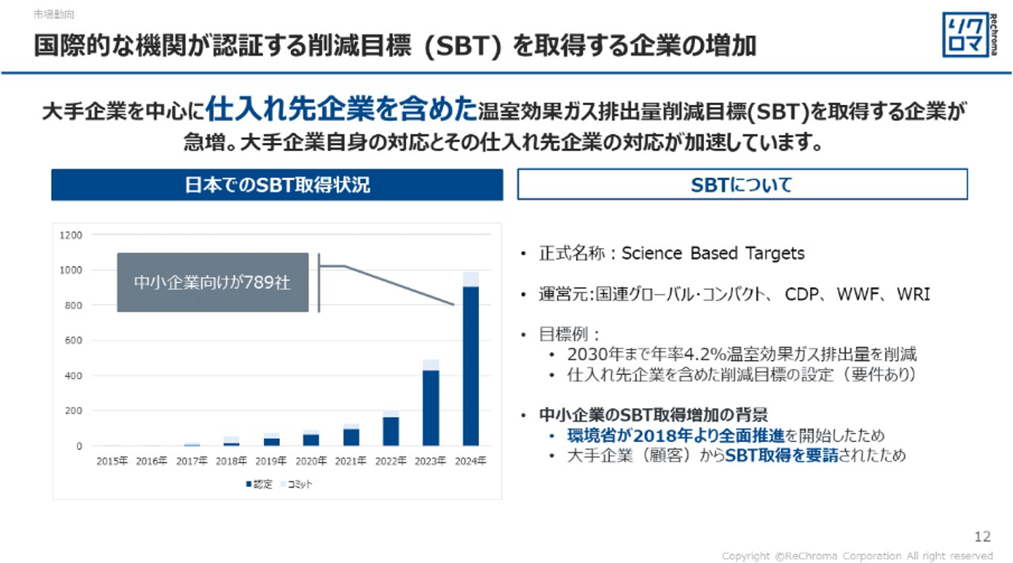 大手企業の中には、投資家の要求や評価機関の高評価を得るために、国際的な温室効果ガス削減目標であるSBT(Science Based Targets)の認定を取得する企業が増えています。