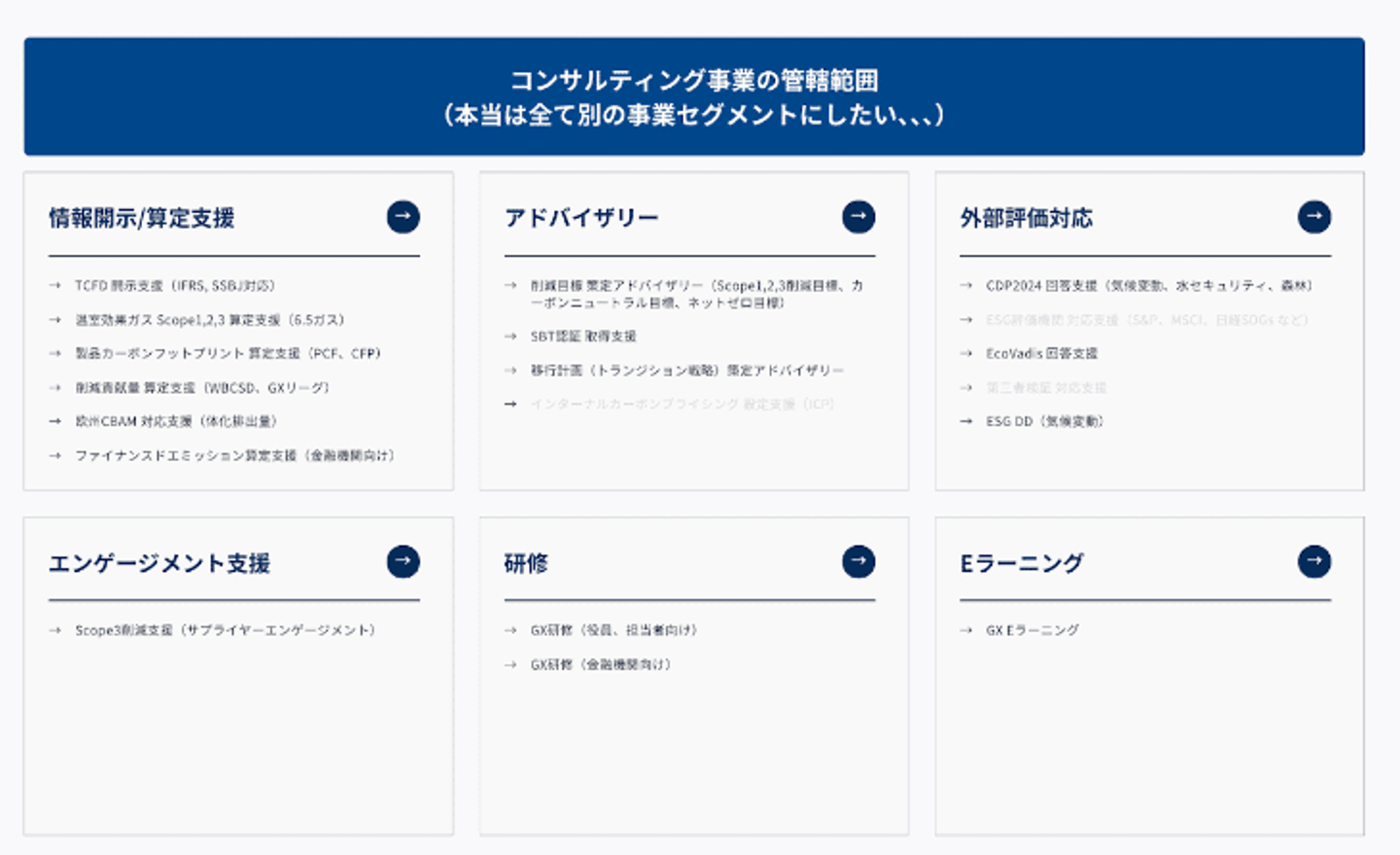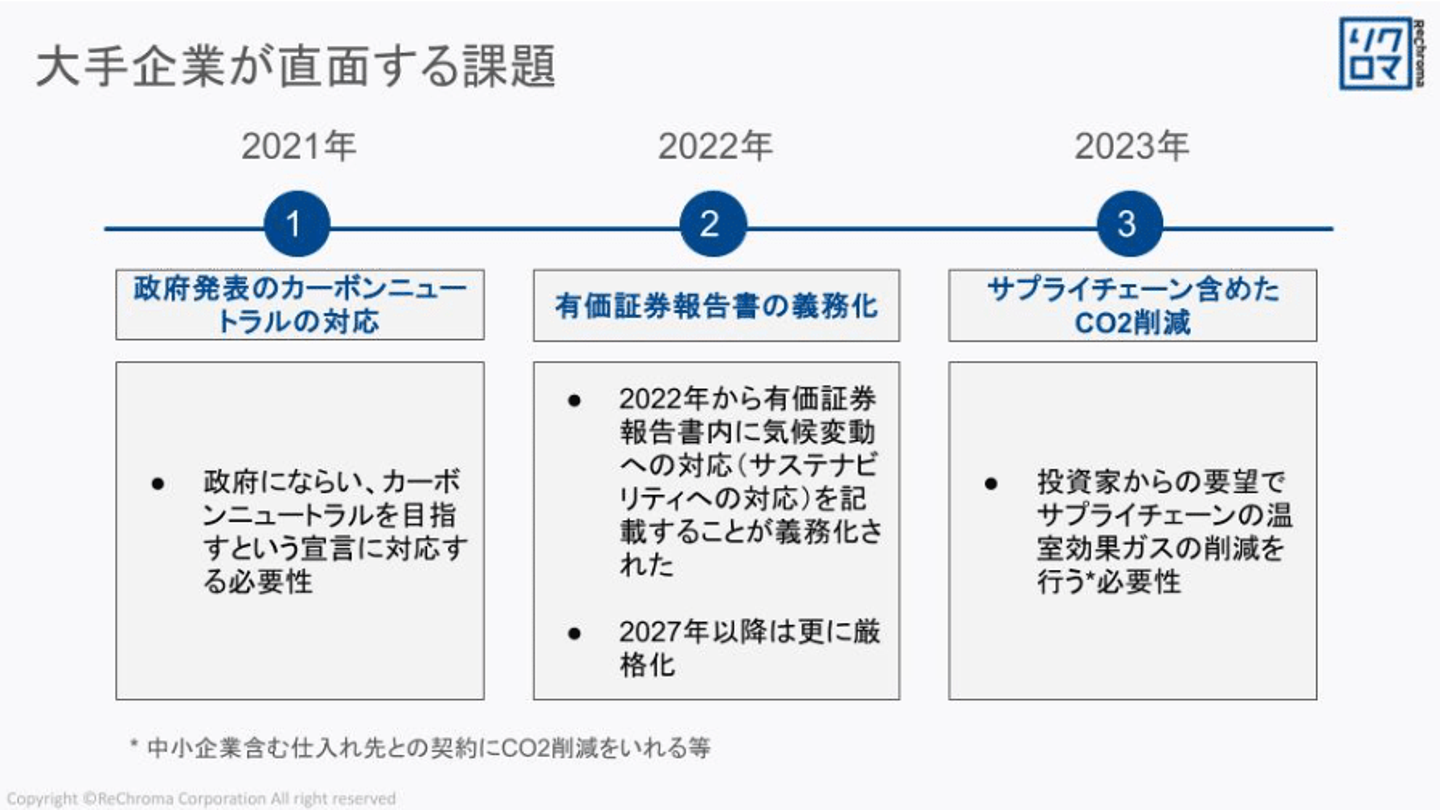 私たちは特に大手企業に対して①カーボンニュートラルの対応や②有価証券報告書対応のサポートからビジネスを始めました。