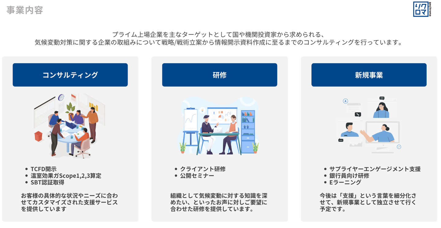 プライム上場企業を中心とした大手企業に対し、2050年ネットゼロ(カーボンニュートラル)を実現するためのコンサルティング、研修、Eラーニングなどを多方面から提供しています。