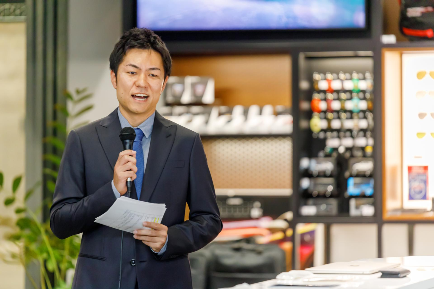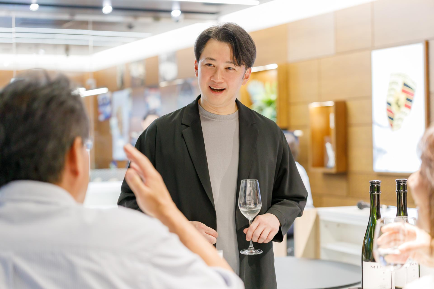 冒頭では、Exclusive Cars Japan代表執行役CEOの鈴木聡大氏がご挨拶と乾杯の音頭を取られ、空間がしだいに温まっていく中、MINAKIブランドオーナー・皆木研二が登壇。「日本酒の味や香りをデザインするだけでなく、どんな余韻を届けるかまで設計すること。それがMINAKIの“体験づくり”であり、ものづくりの真髄」と語り、ポルシェとの共演が実現した背景や、日本酒造りに込めた思想を伝えました。