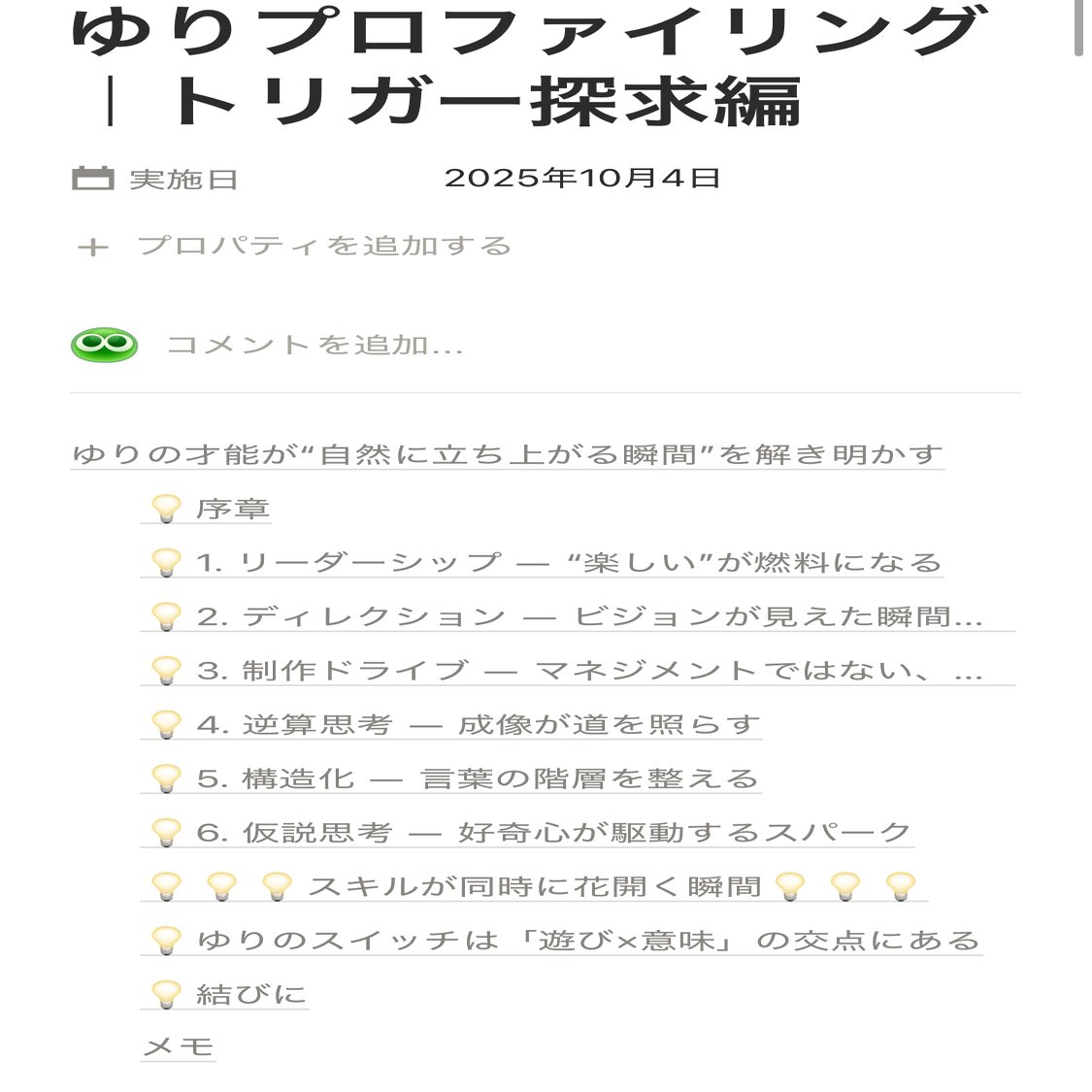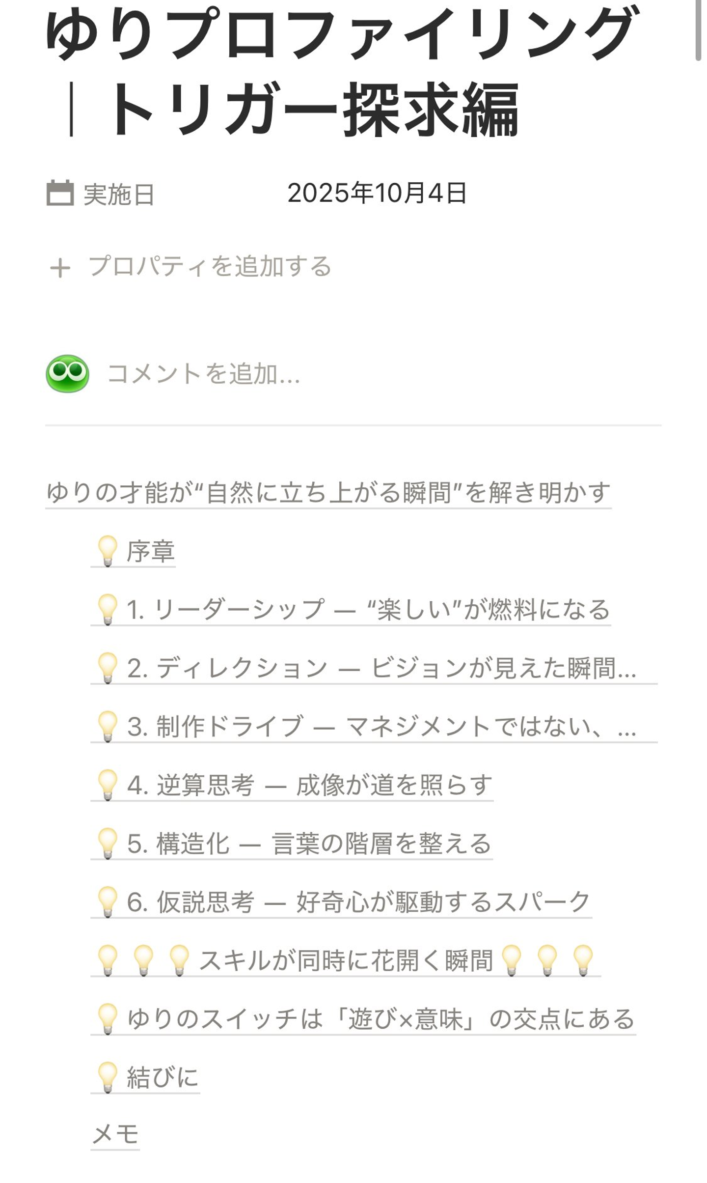 今私は取締役の筒見にマネジメントをしてもらっていて、ある日「ゆりのプロファイリングしといたから」と壮大なNotionを共有されました。