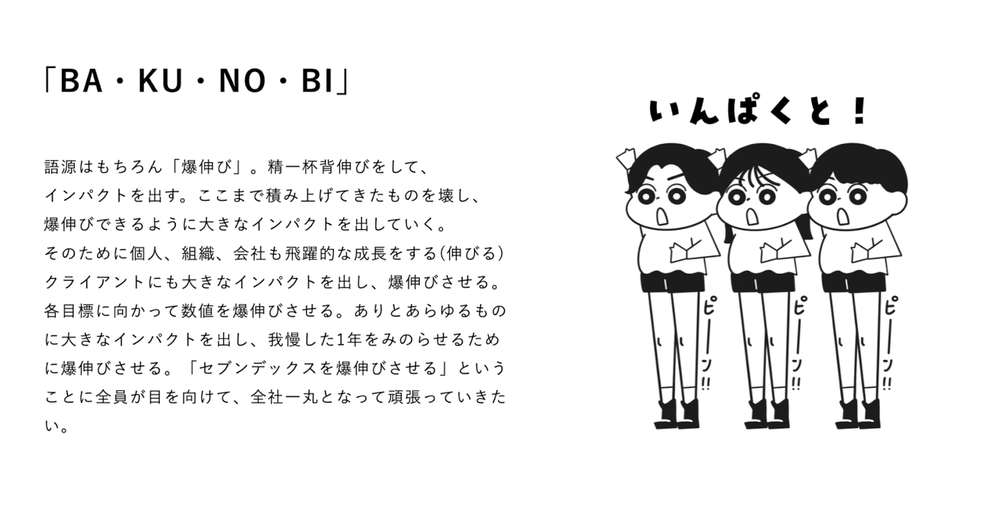 セブンデックスの第6期スローガンである「BA・KU・NO・BI (バクノビ)」を体現していくために、ディレクター、デザイナー、人事、広報、経営企画など様々な職種のメンバーが、それぞれの視点から