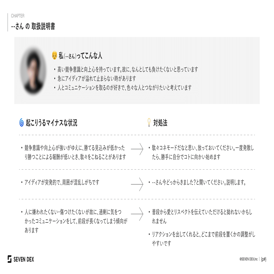 - 他のメンバーが、資質を理解した上で、その人に対してどのようにコミュニケーション・対応をすれば良いか考える。