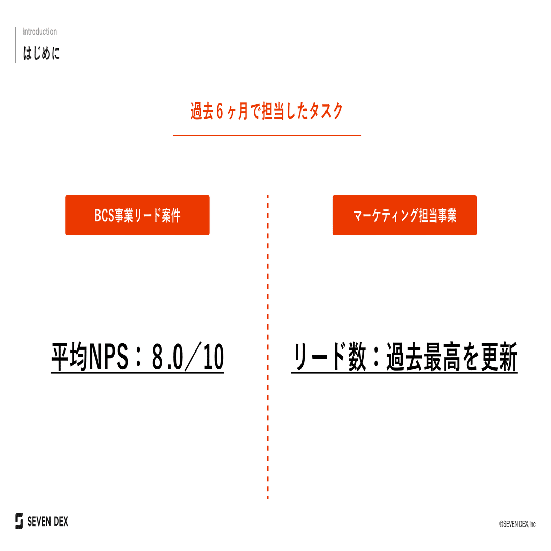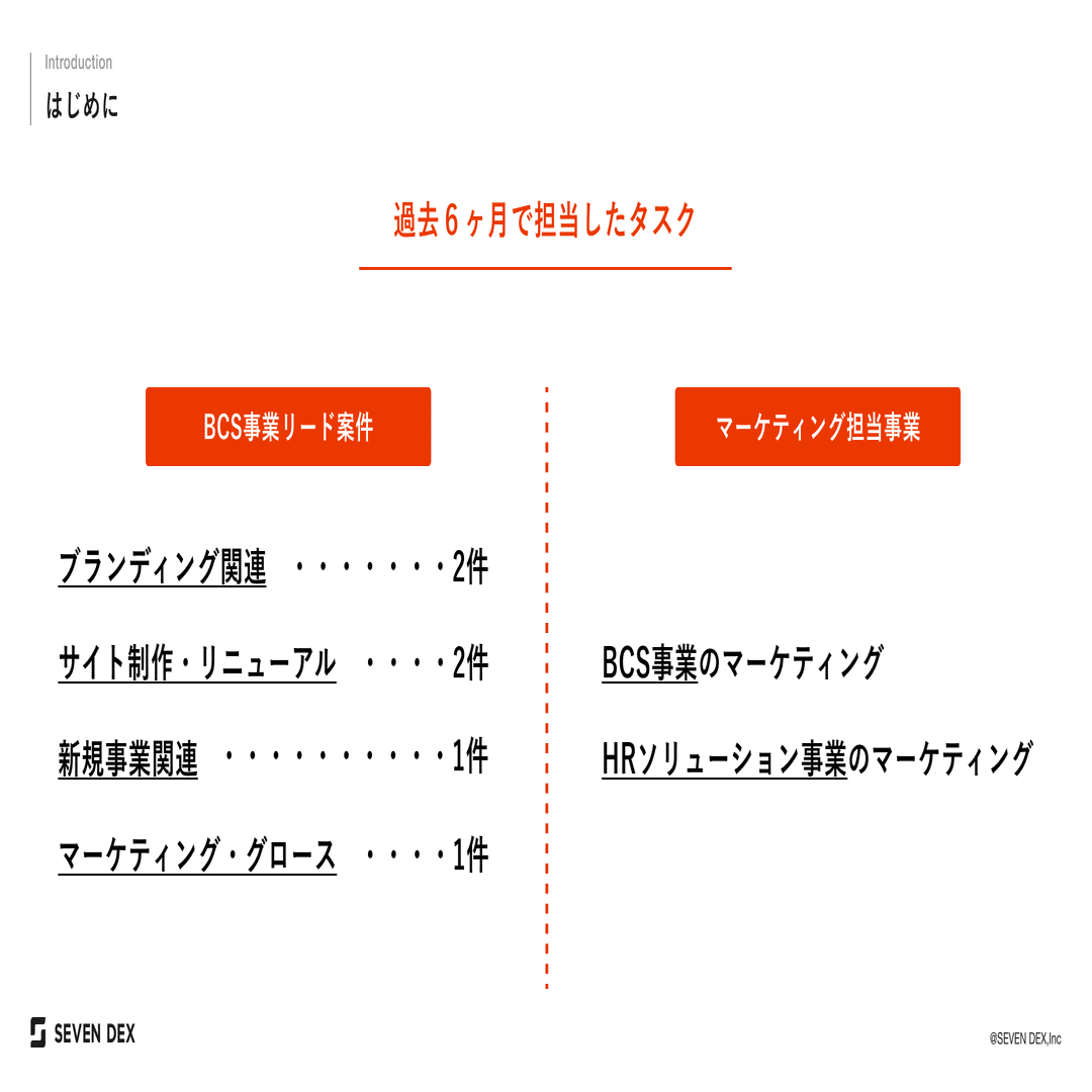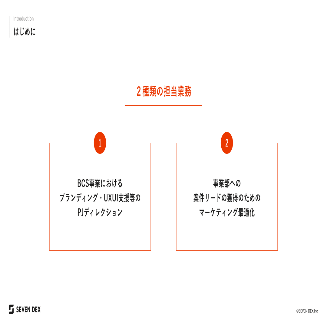 私は現在、①セブンデックスでブランディングやUXUI、新規事業の支援をおこなうビジネス・クリエイティブ・スタジオ事業(以下、BCS事業)のビジネスディレクターと、②事業部へのリード獲得を目的としたマーケティング部門の2つを兼務しています。