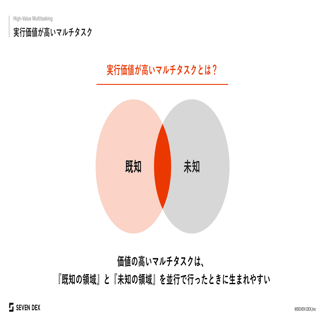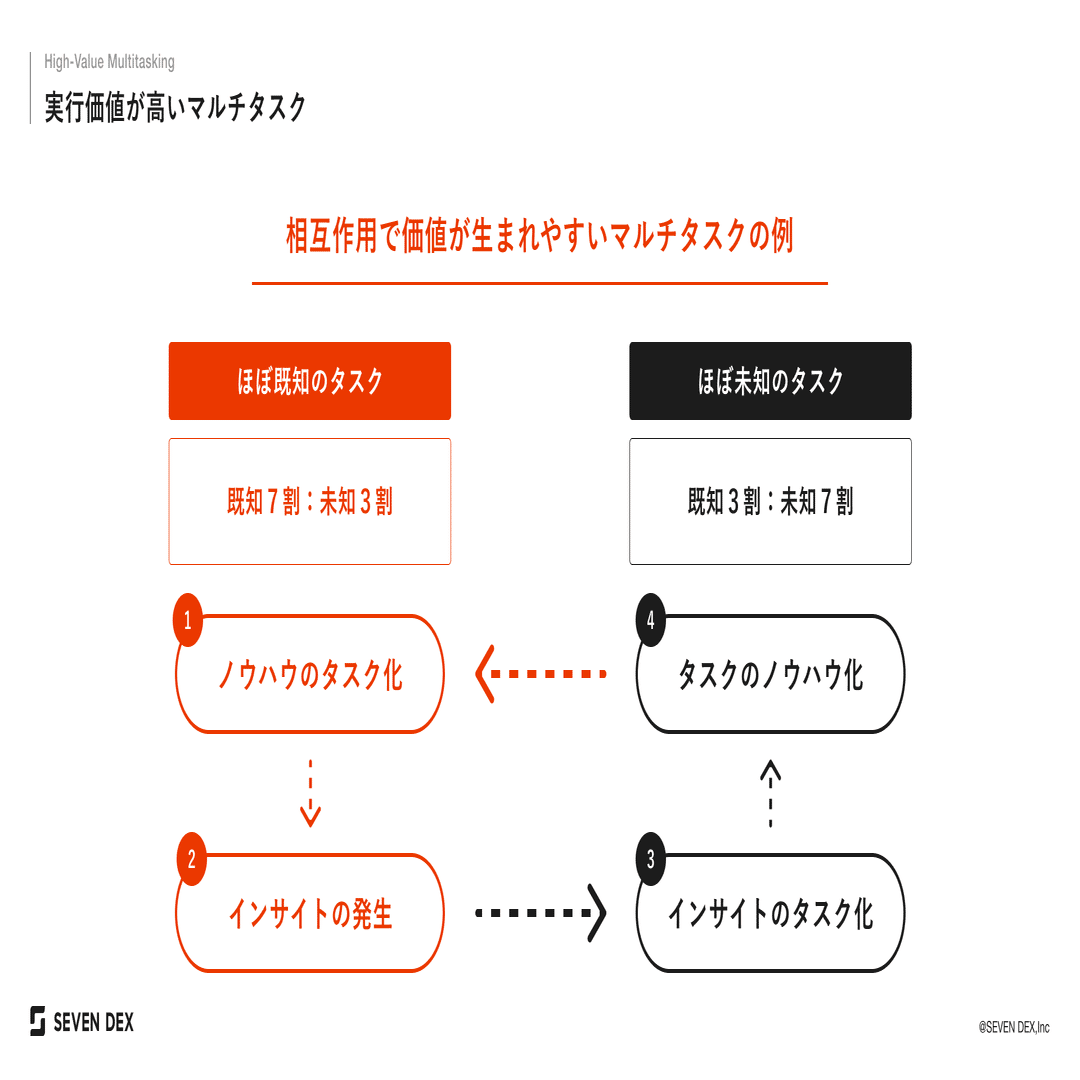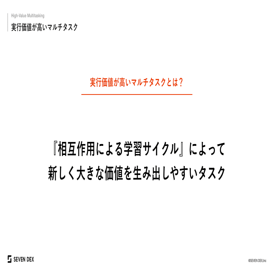 実行価値が高いマルチタスクとは、タスク同士の相互作用によって学習サイクルが回り、新しく大きな価値を生み出しやすいタスクを並列でおこなうことだと考えます。