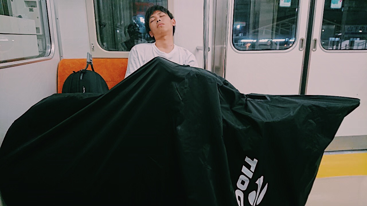 ↑電車の中で自転車と共に爆睡中の櫻井氏。お疲れモードのご様子ですねぇ。