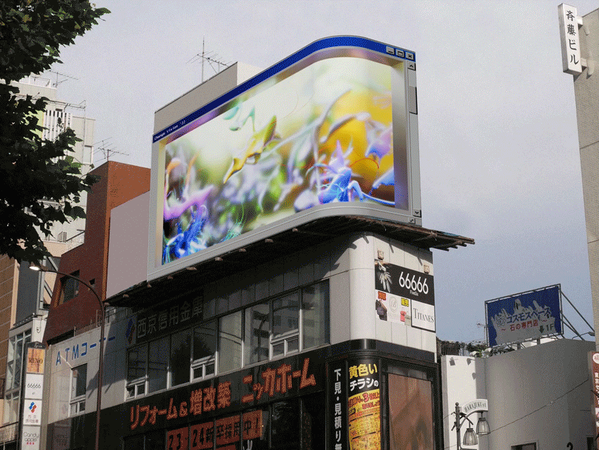 裸眼3Dは、作る前の段階は普通の3Dコンテンツとほぼ同じです。違いが出るのは仕上がりの工程で、レンダリングした後にビジョンの物理的な形状や曲がり方に合わせて、角度を調整・アレンジします。CHANGE ViSiON原宿のビジョンは何度もやっているので大丈夫ですが、新しいビジョンの場合はデータをちゃんと取って、最低1〜2回のテスト放映を経てベストな見え方に仕上げていきます。そこが普通の3Dコンテンツよりちょっと難しくなる部分ですね。