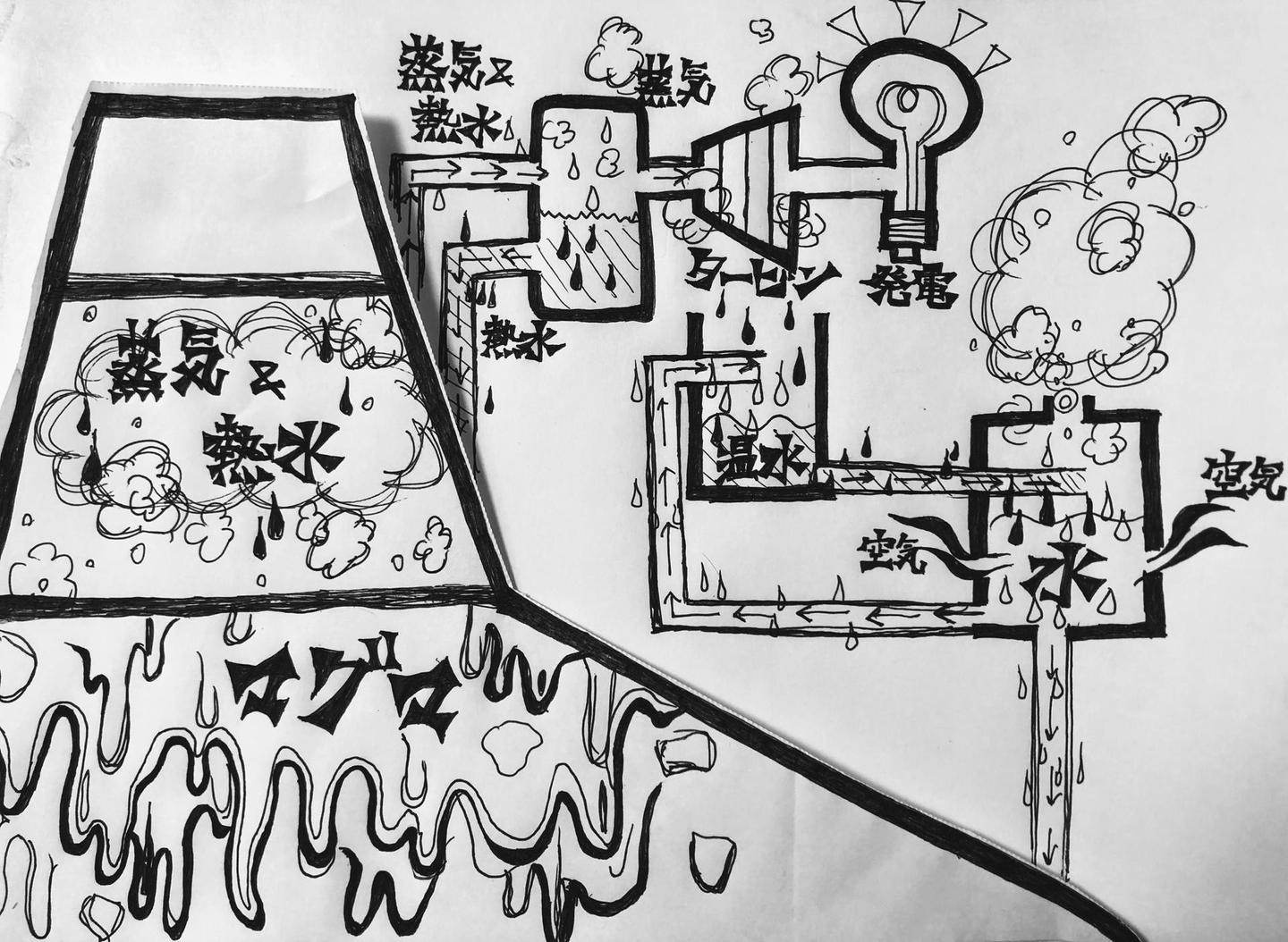 ③蒸気の力でタービンという発電するための機械を動かす(タービンに使った蒸気が熱水になる→熱水 を冷やして水にする→井戸に戻す)