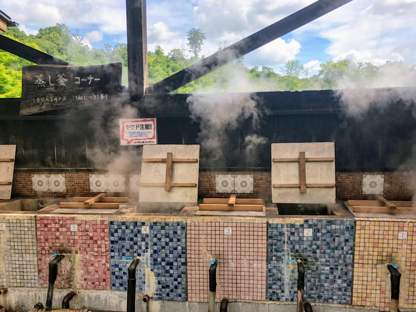 また、蒸気を使って食べ物を蒸す蒸し器も各家庭や施設に設置されています。通称 地獄蒸し です。