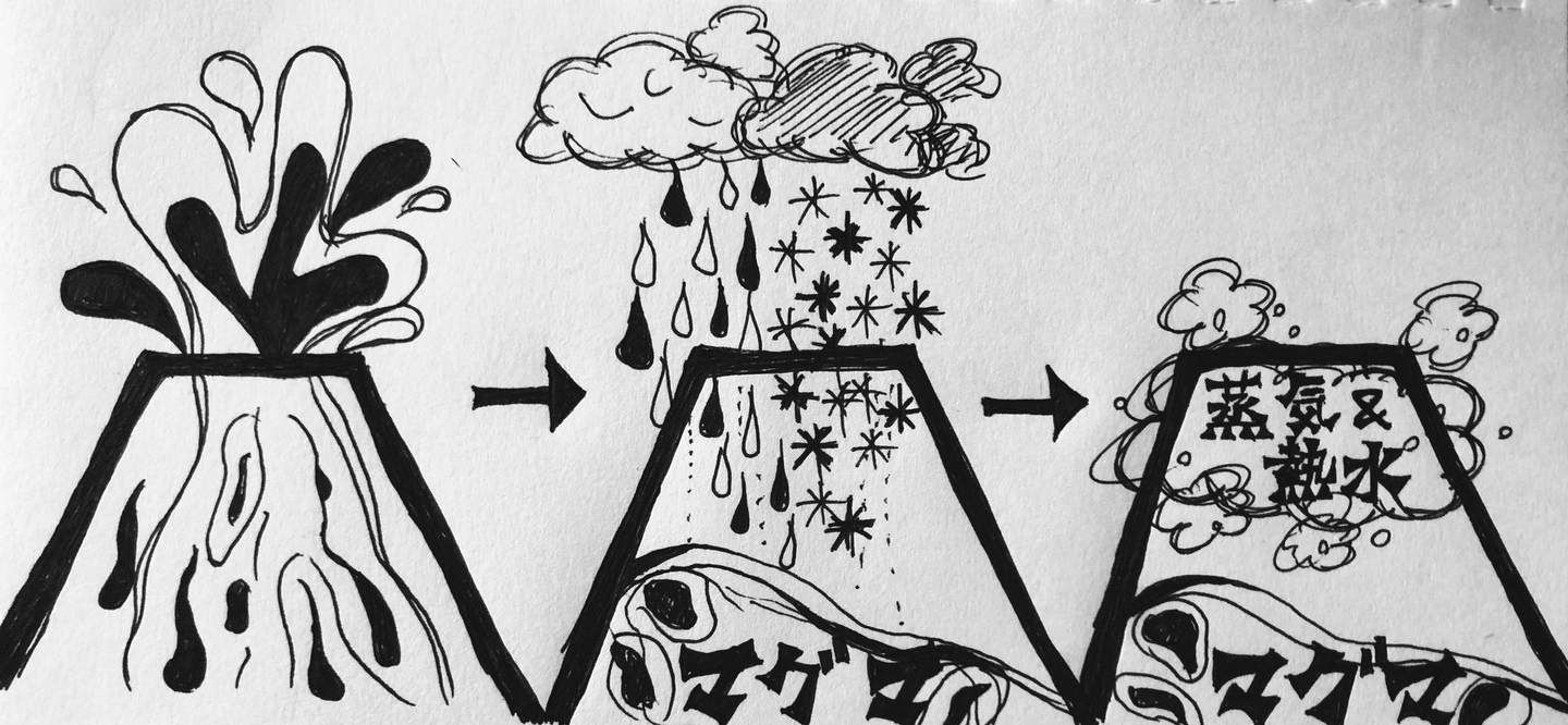 真ん中は、雨や雪が降っている様子です。すると、地表に雨水が浸みこんでいきます。その雨水がマグマによって温められて、蒸発します。そして右端のように、蒸気や熱水がたまる層が地中にできます。