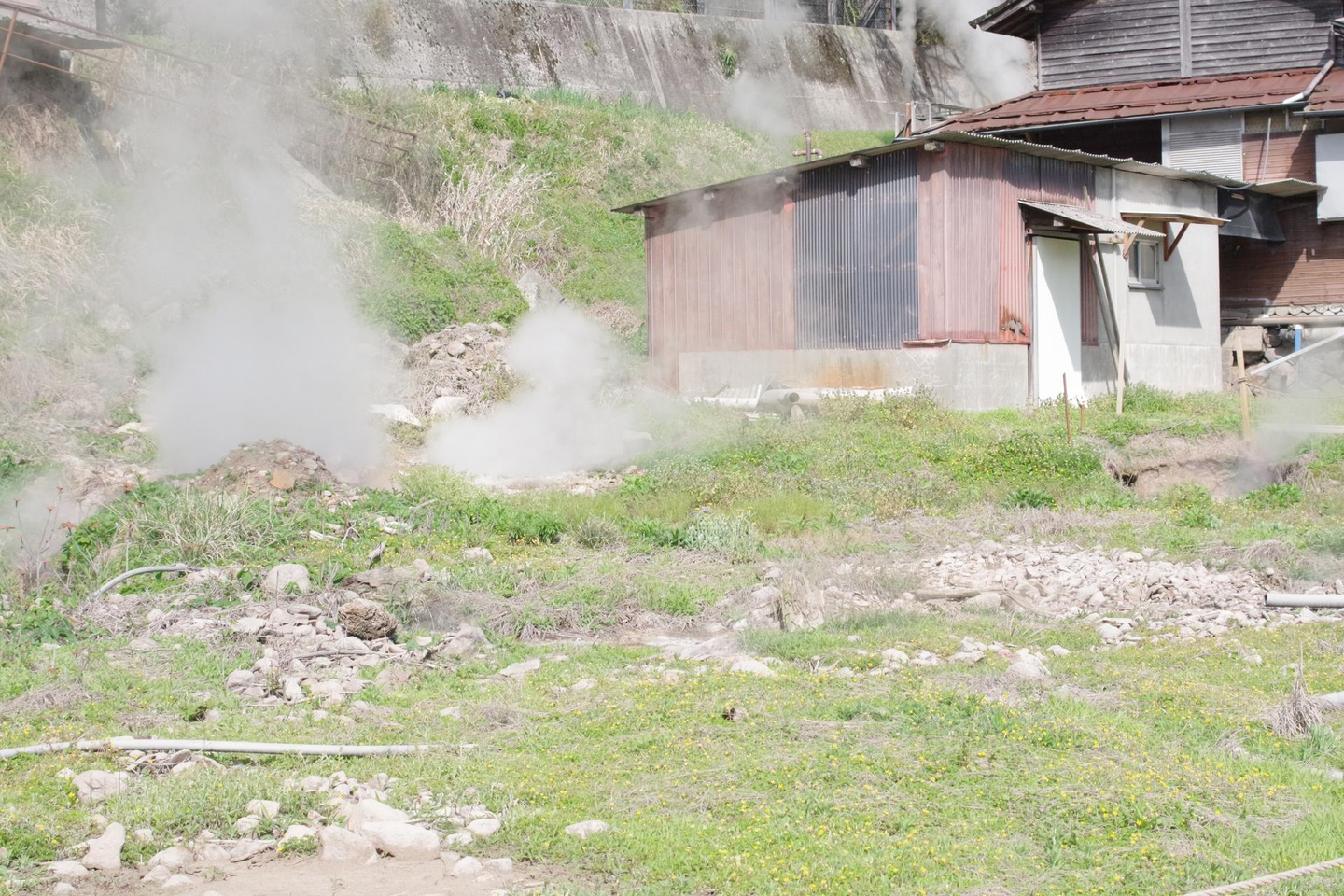 ここはわいた地区大地獄の写真。新緑の緑、黄色、紫のお花が一斉に咲き、一気に華やかになります。
