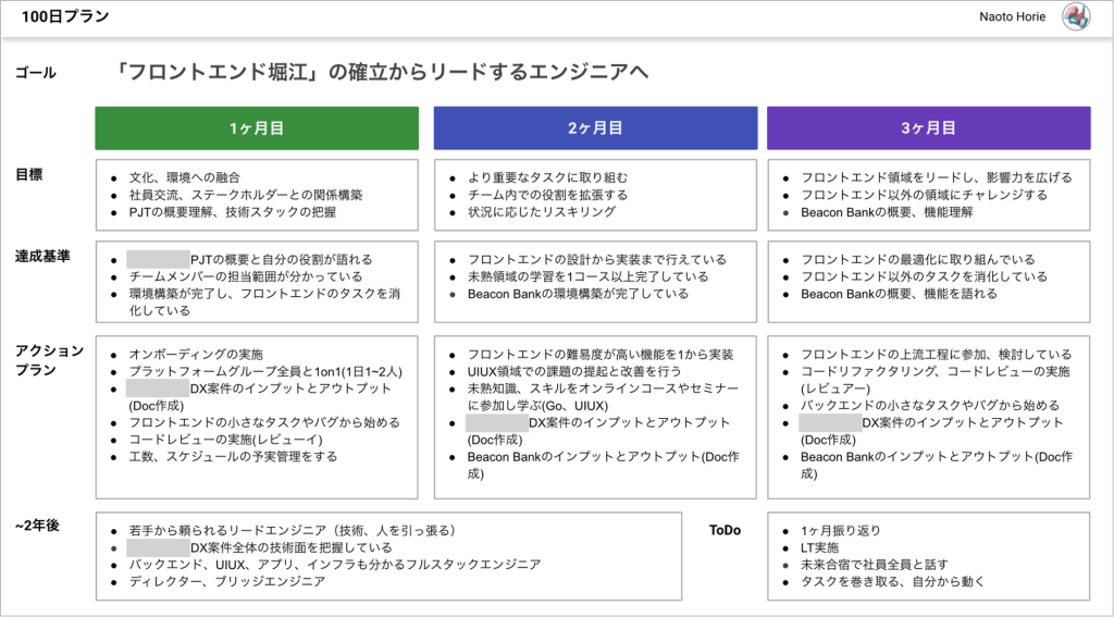 これを作る事により、アクションプランが明確になりました。また、業務が忙しくなった時にも「100日プラン」に立ち戻り、最初の決意や、やるべきことを思い出せたのは良かったです。