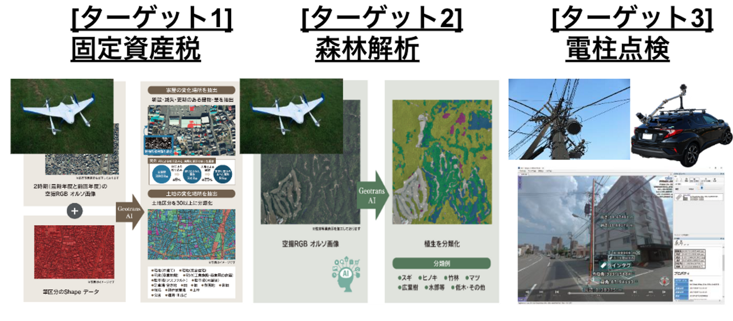 そんな課題に対し、Geotransでは、ドローン、航空機、人工衛星、MMS(移動計測車両)で撮影した画像を独自のAIで解析し、行政やインフラ企業に必要な空間データや分析結果を自動作成、目視で行っていた作業を自動化することで作業の大幅な効率化を実現させることに成功しています。