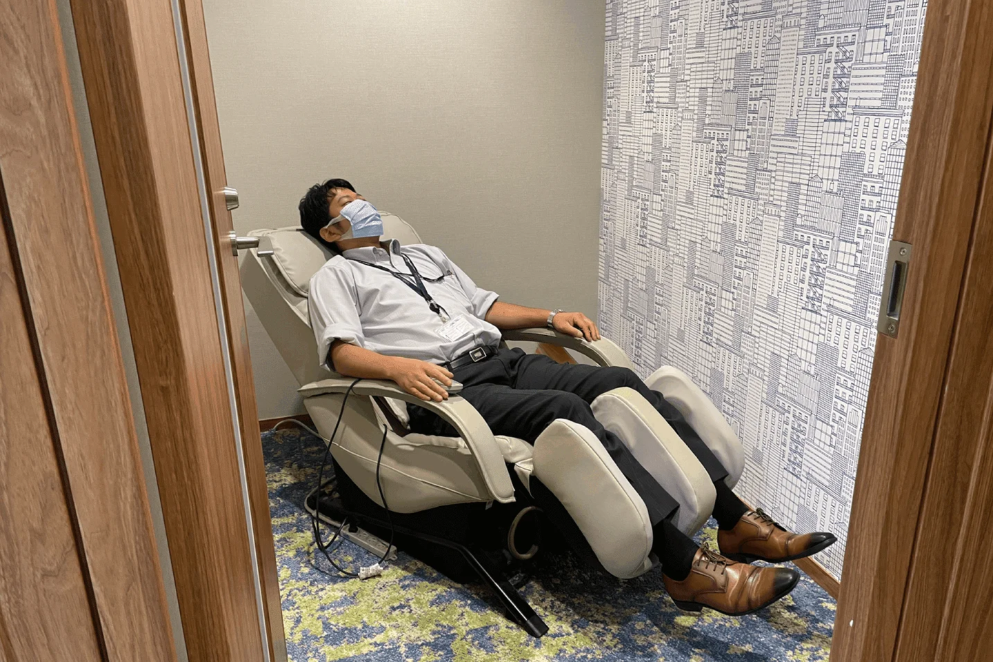 昼休憩のタイミングはもちろん、外出先から戻った後マッサージチェアで数分リラックスしてからデスクワークに取り組んだり、集中力が切れた際に照明の落ち着いた空間で気持ちを切り替えるなど、活用シーンはさまざまです。
