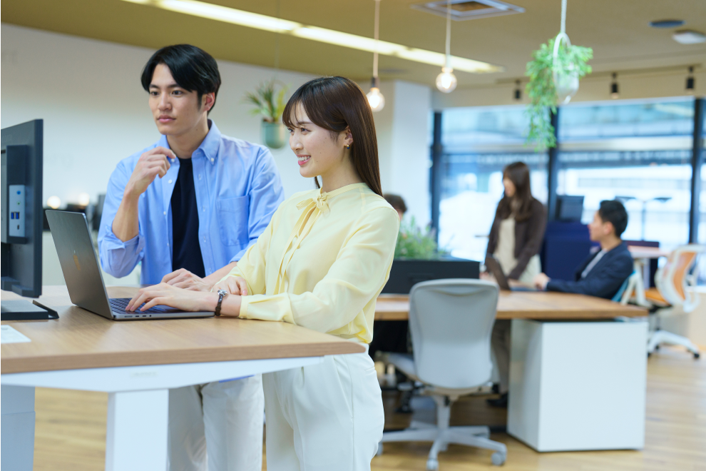 また、立って仕事をすることで、歩いている人と視線が合いやすくなり、話しかけやすくなるというメリットがあることもわかりました。その結果、部署内を問わず会社全体でのコミュニケーションも活発に行われています!