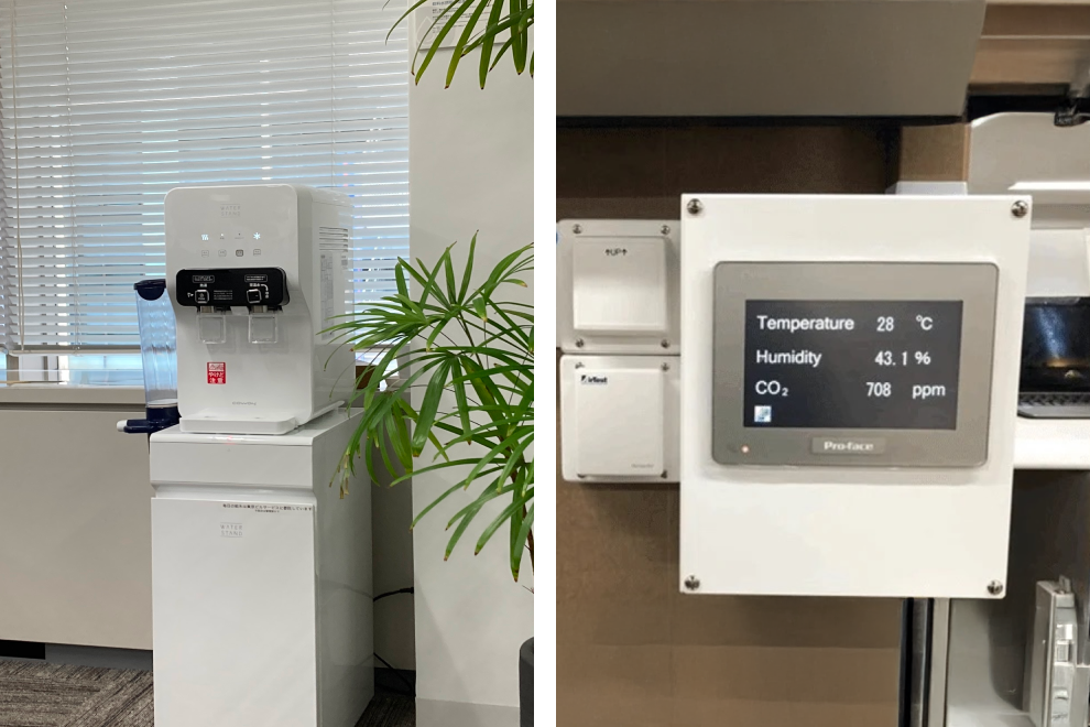 従業員が快適に過ごせるよう、オフィス内には30mごとにウォーターサーバーを設置しています。さらに、温度・湿度・CO₂濃度をリアルタイムで測定する空気質センサーも導入し、空間管理も行っています。